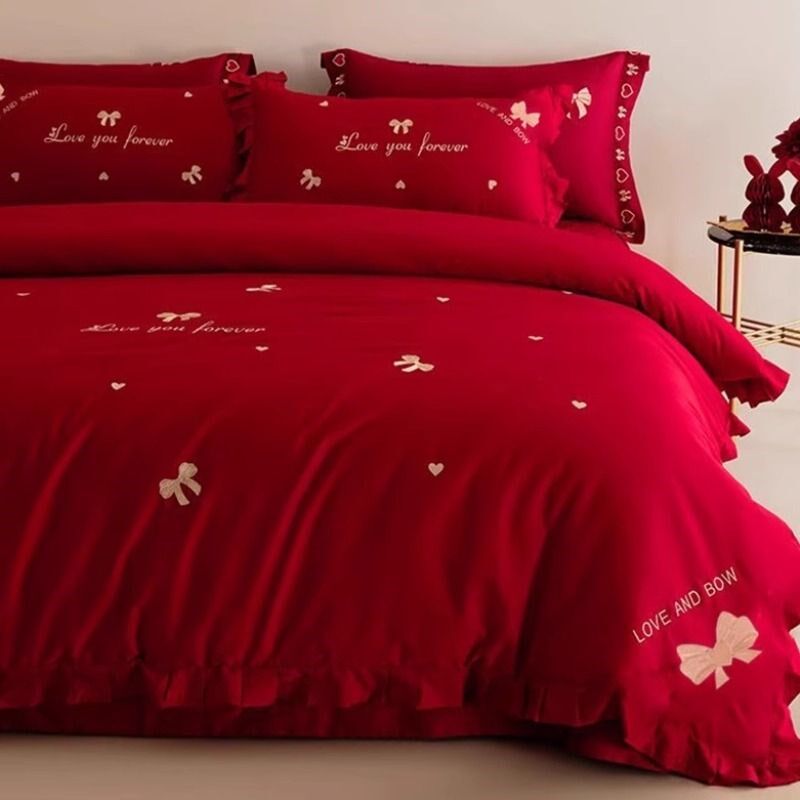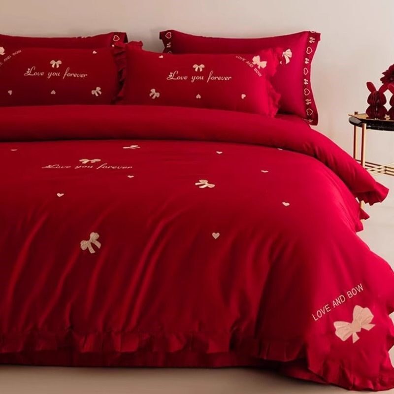 浪漫蝴蝶结婚庆四件套大红色被套刺绣新婚婚庆床单高级感床上用品