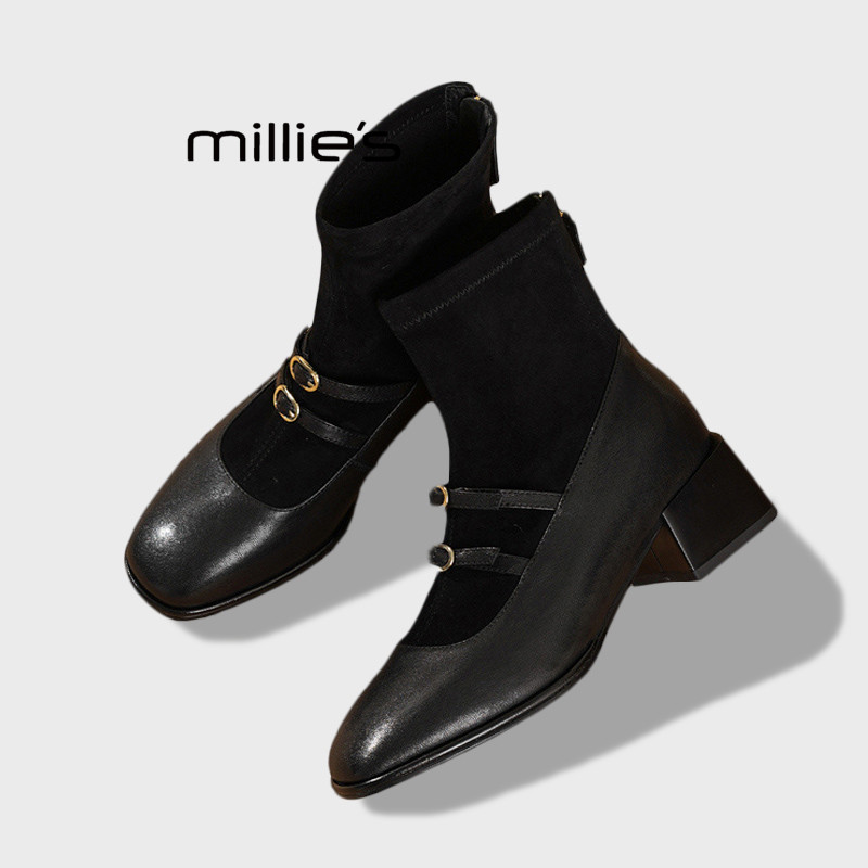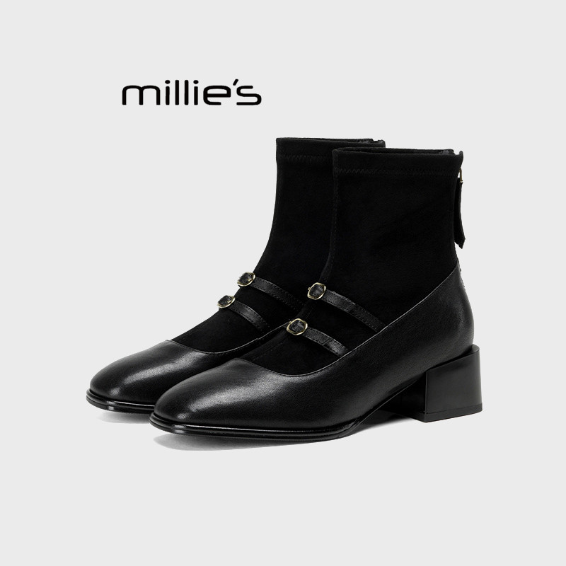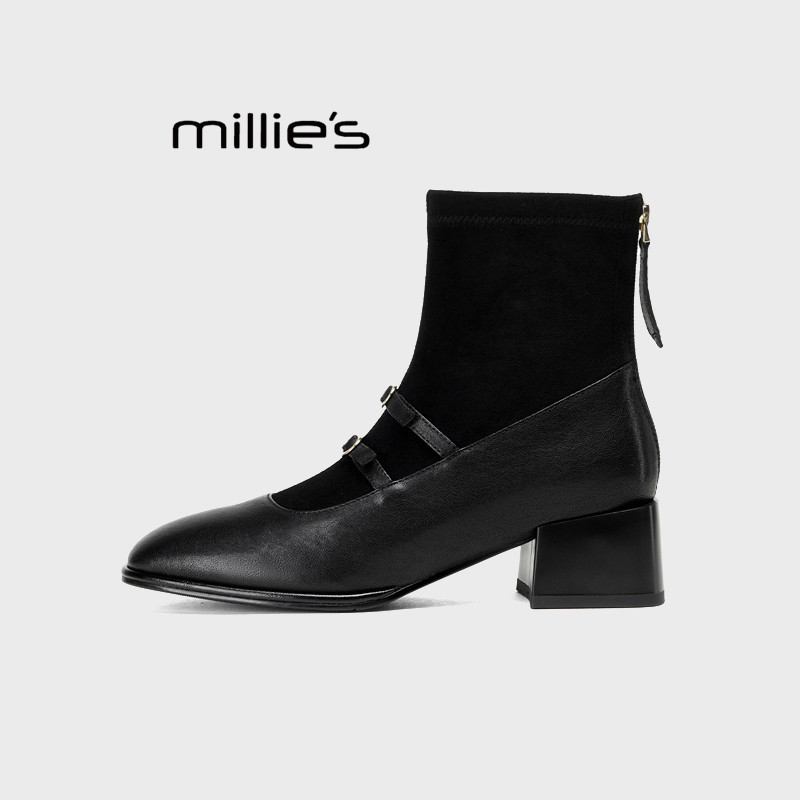 MILLIE'S/妙丽女鞋秋冬款时尚百搭新中式玛丽珍靴粗跟瘦瘦靴袜靴Z