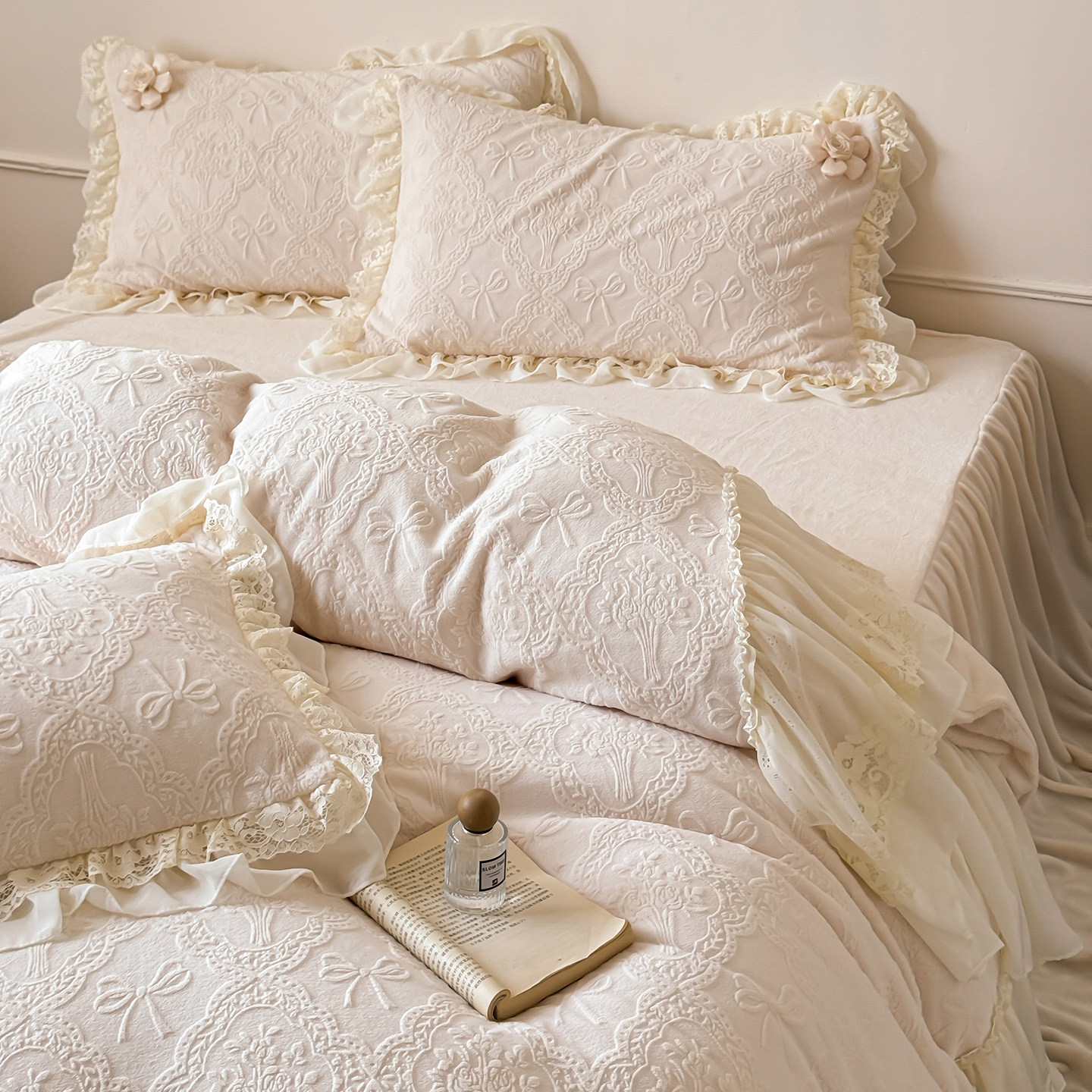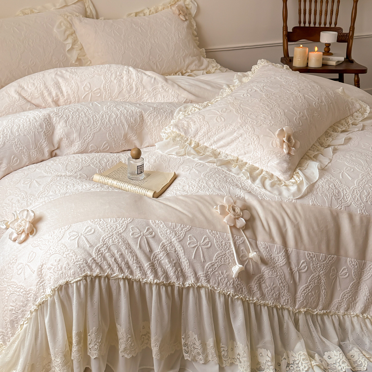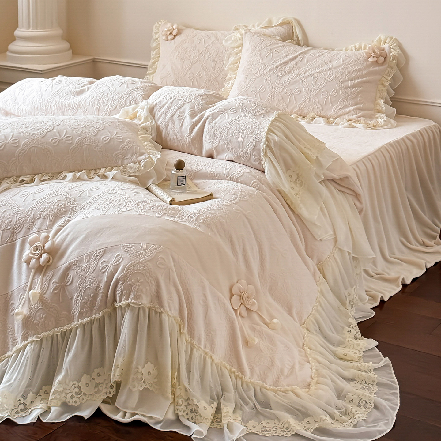 法式冬季轻奢雕花牛奶绒四件套公主风珊瑚绒蕾丝被套保暖加厚床裙
