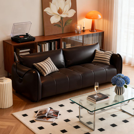 中古风生态真皮沙发小户型客厅卧室公寓直排黑色双人沙发皮艺办公