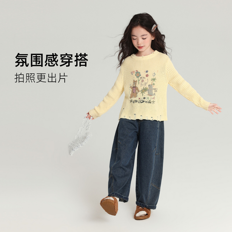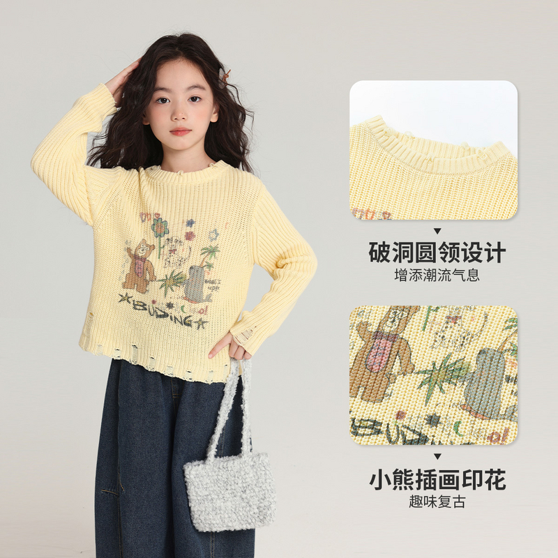 布丁哈鲁童装秋装女童上衣2025春秋新款儿童纯棉小熊插画毛衣