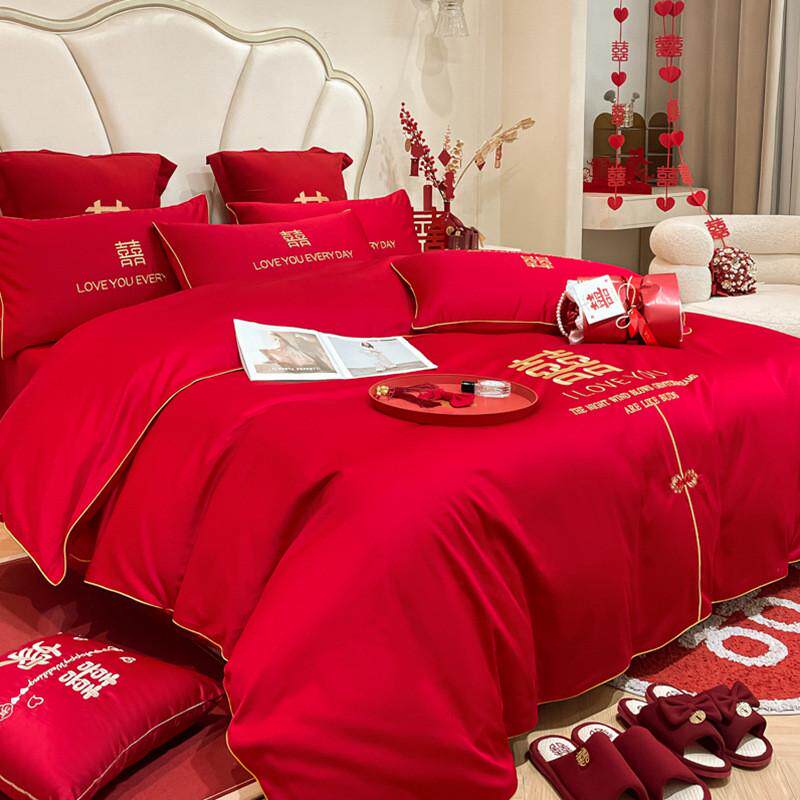 高档中式龙凤刺绣结婚四件套大红色婚庆床品亲肤棉喜被床单被套