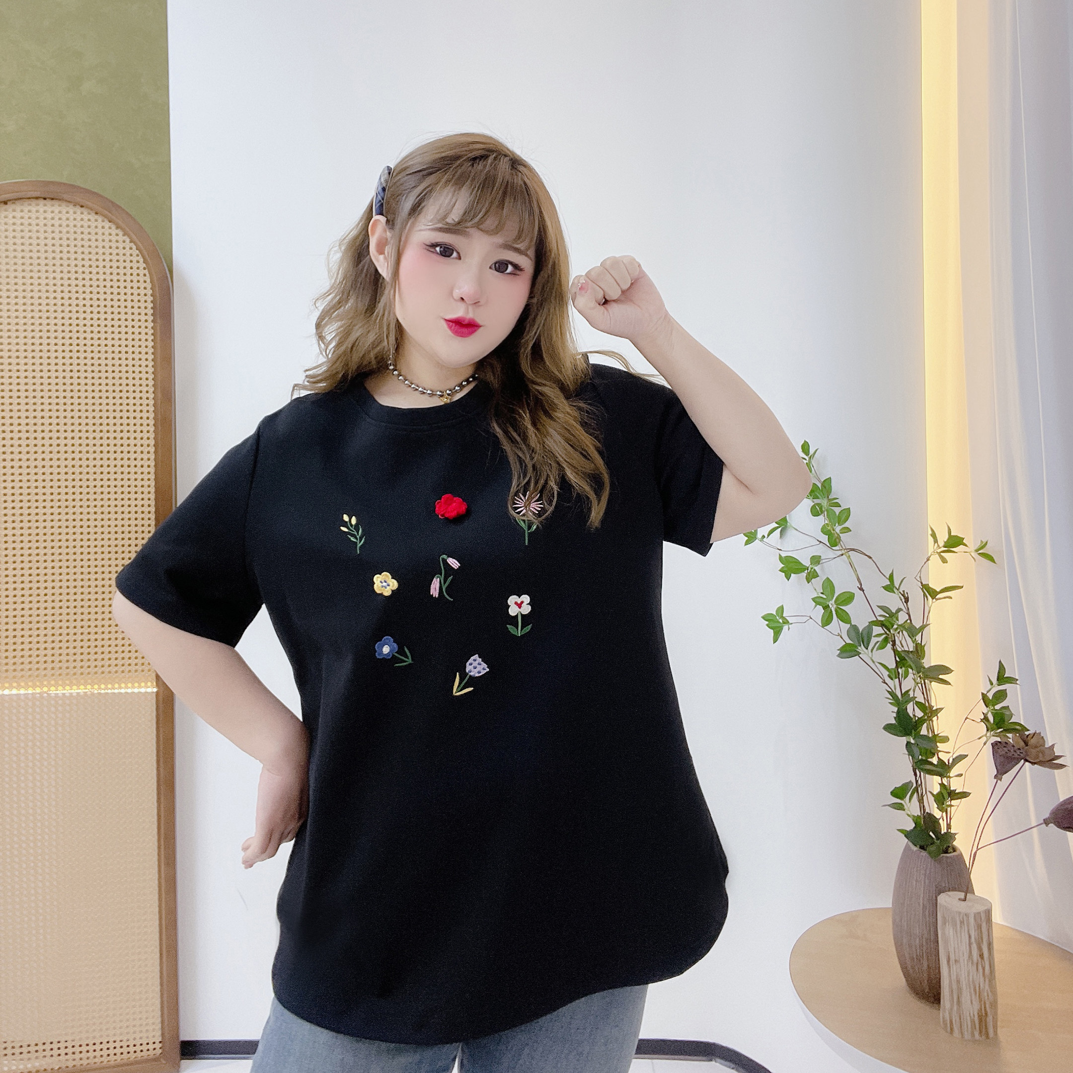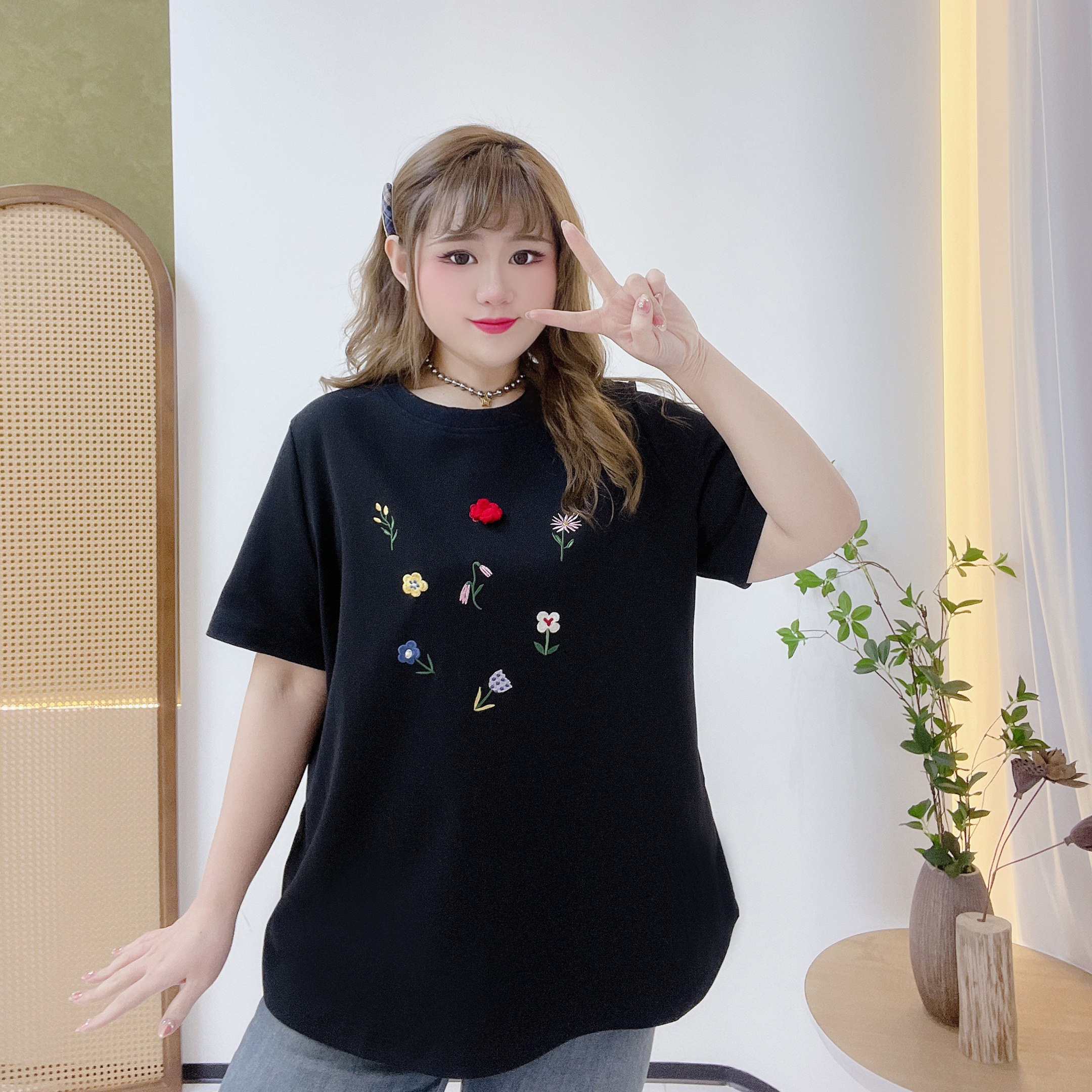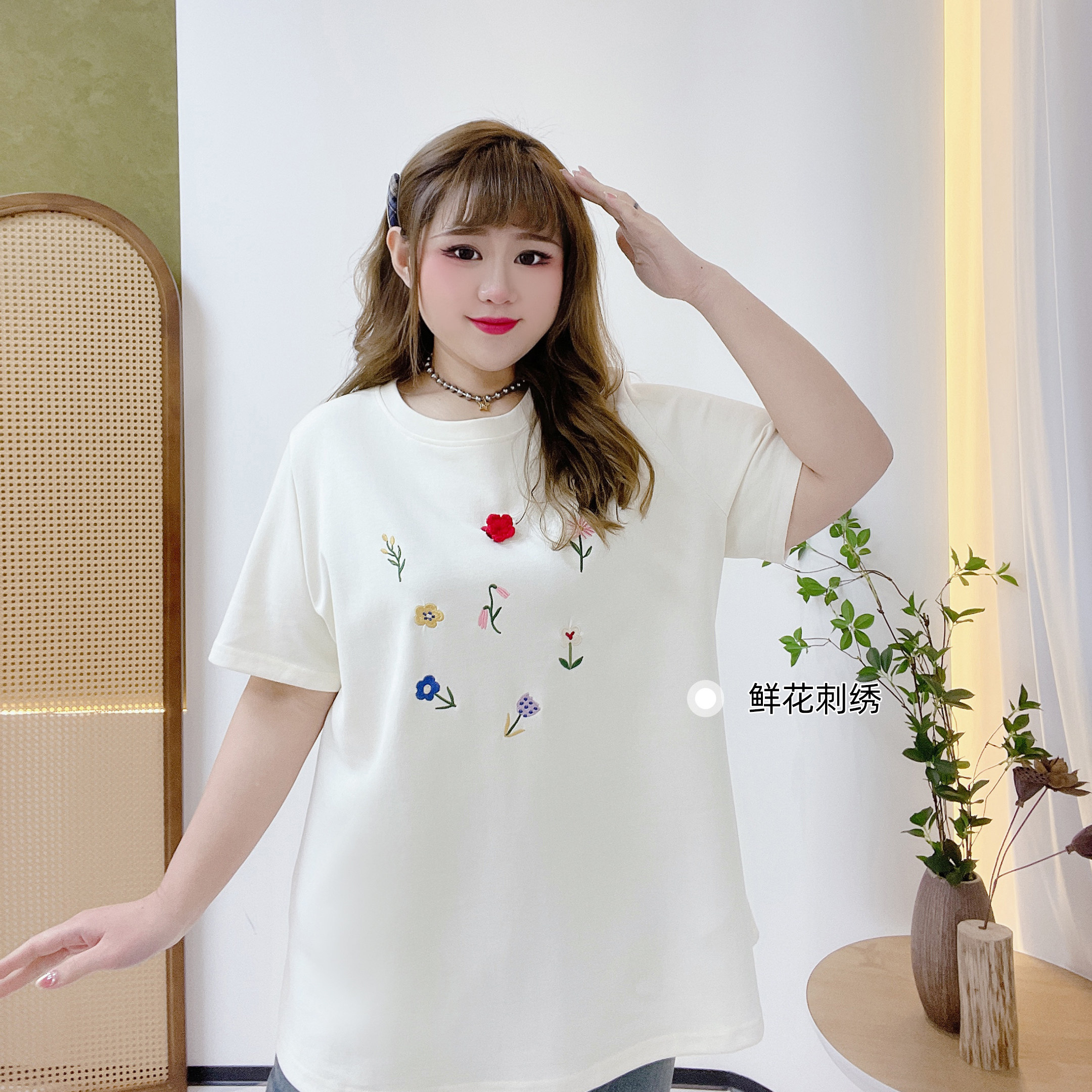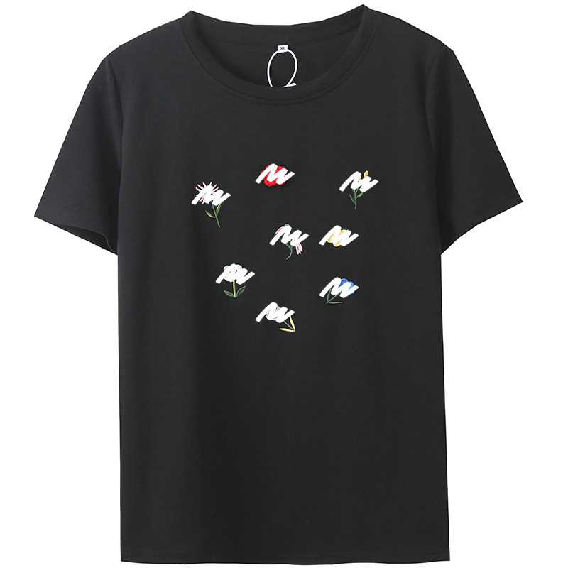 大码宽松减龄鲜花刺绣圆领t恤