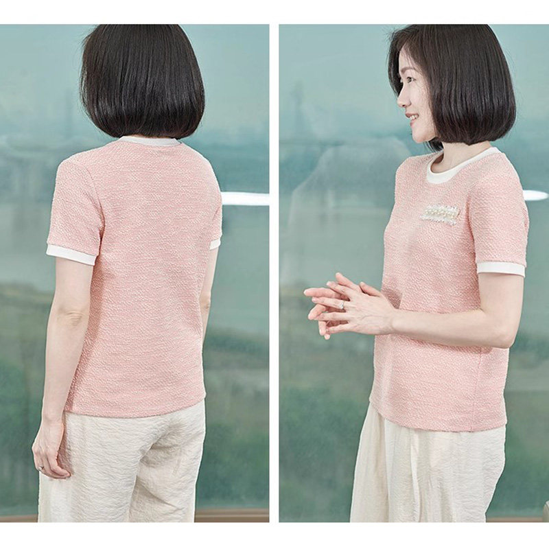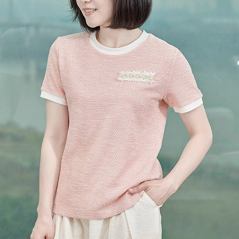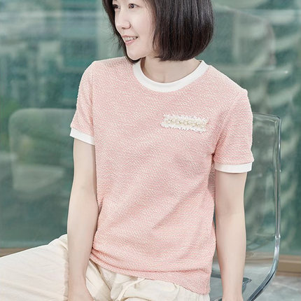 粉色高级感圆领撞色短袖女t恤夏2025新款休闲宽松短款针织衫上衣