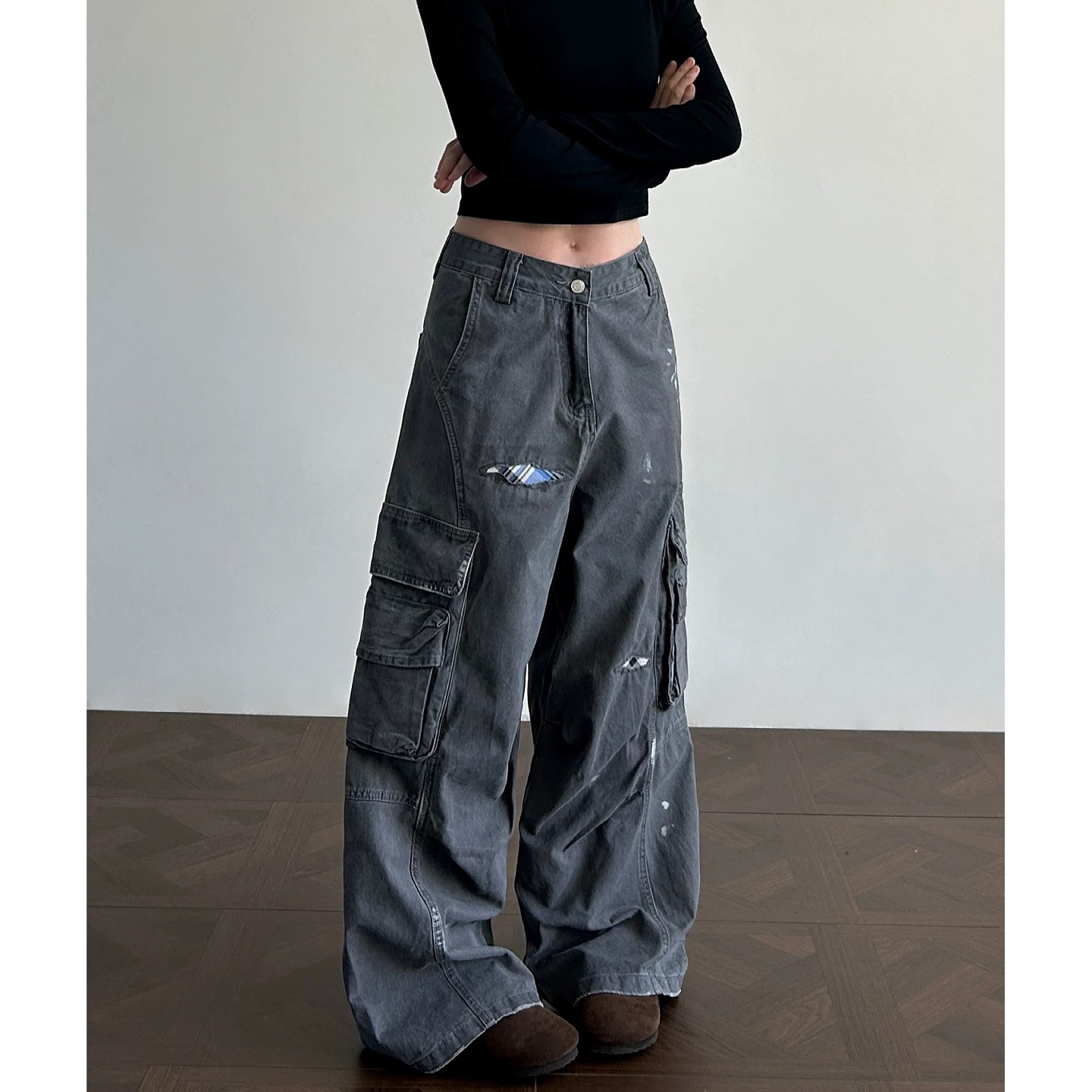 大码美式水洗做旧格纹贴布工装牛仔裤男女高街宽松显瘦泼墨休闲裤