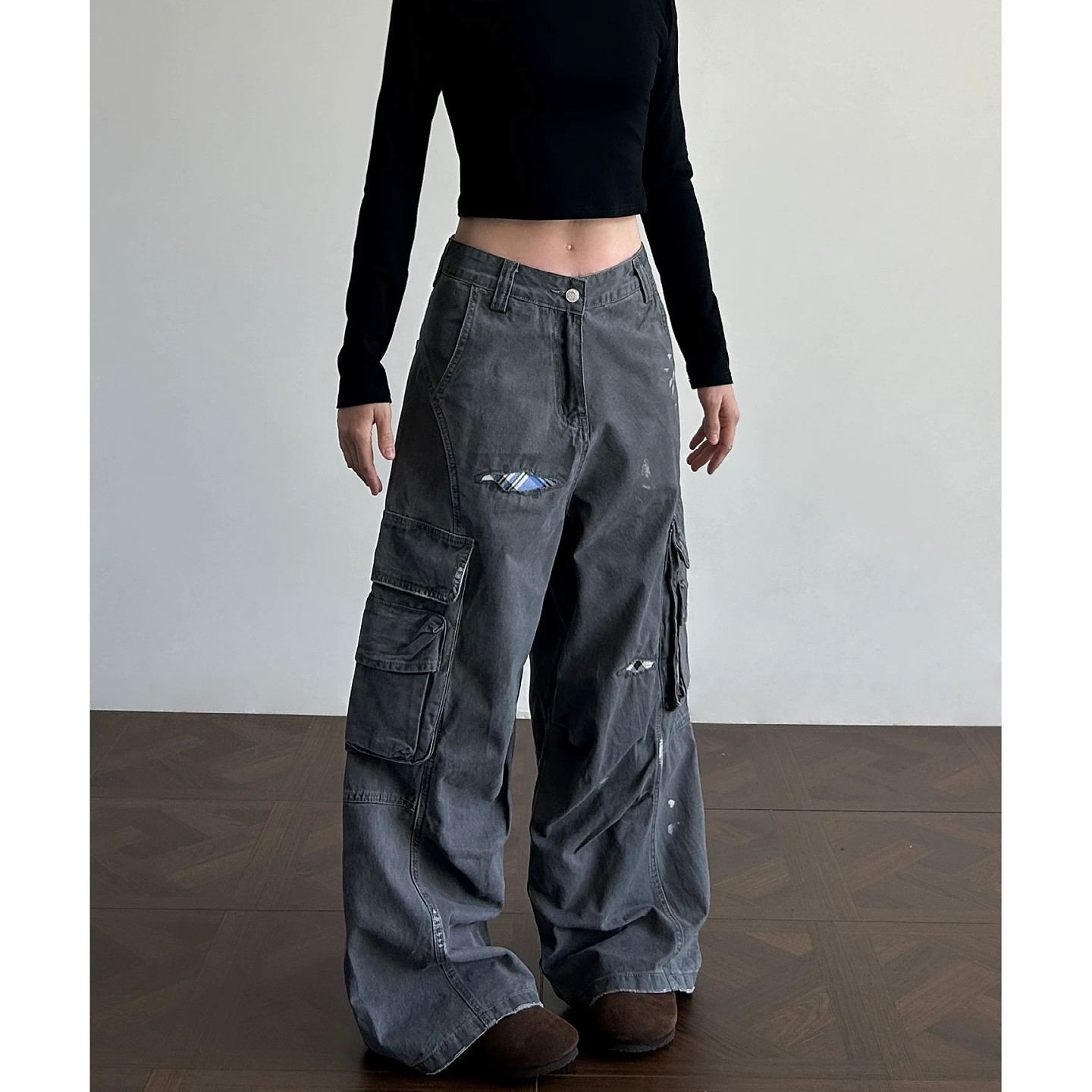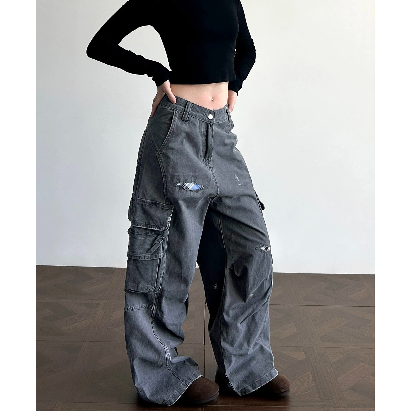 大码美式水洗做旧格纹工装牛仔裤