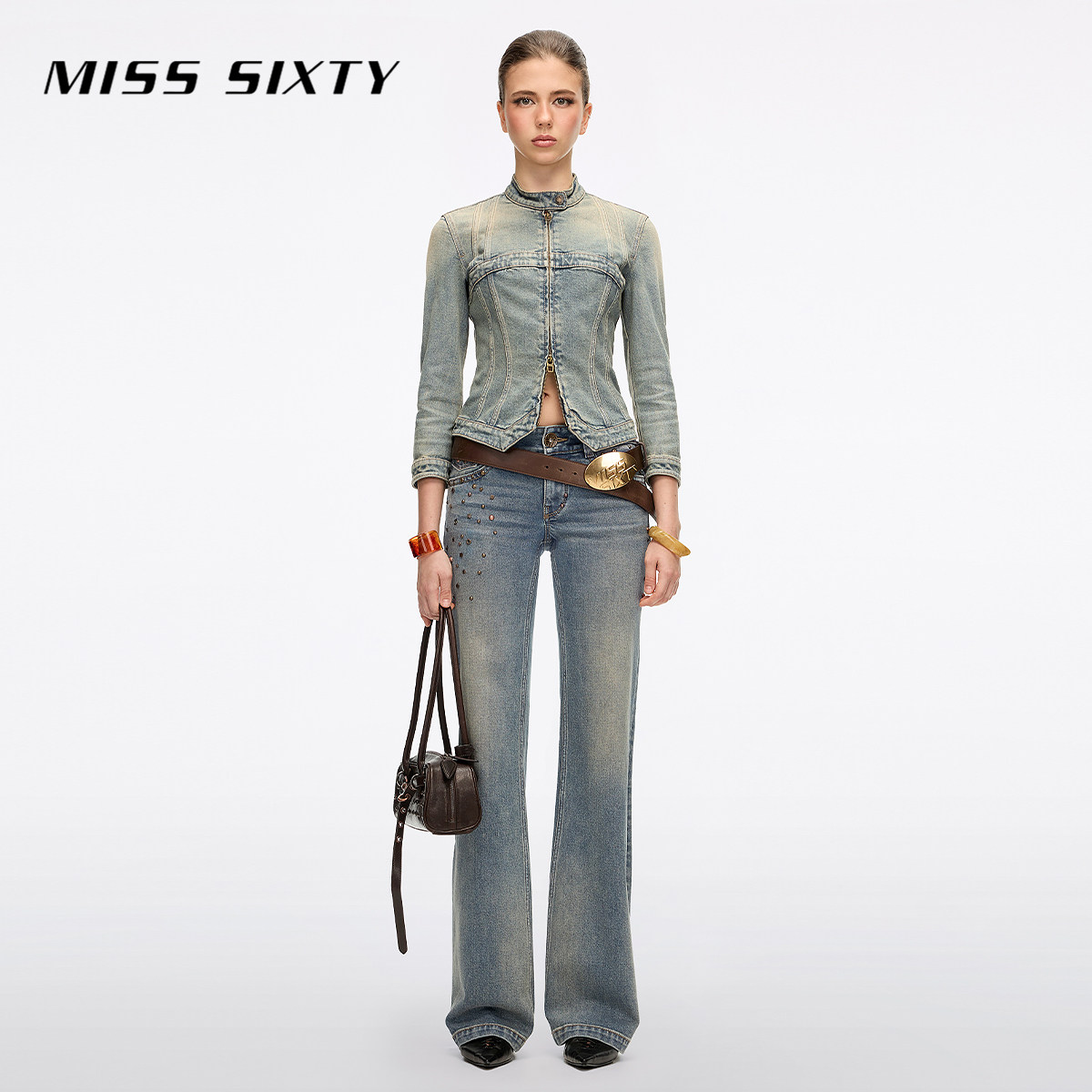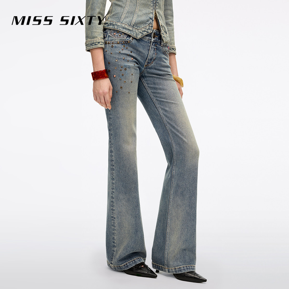 Miss Sixty2026春季新款牛仔裤女中腰做旧撞钉磨破显瘦修身喇叭裤