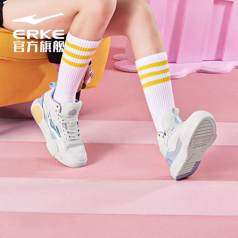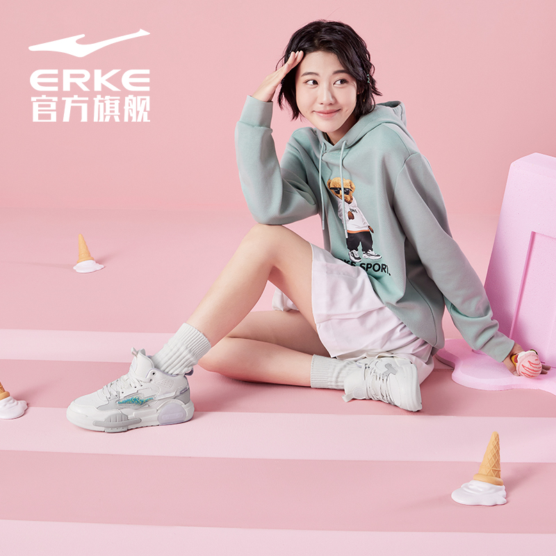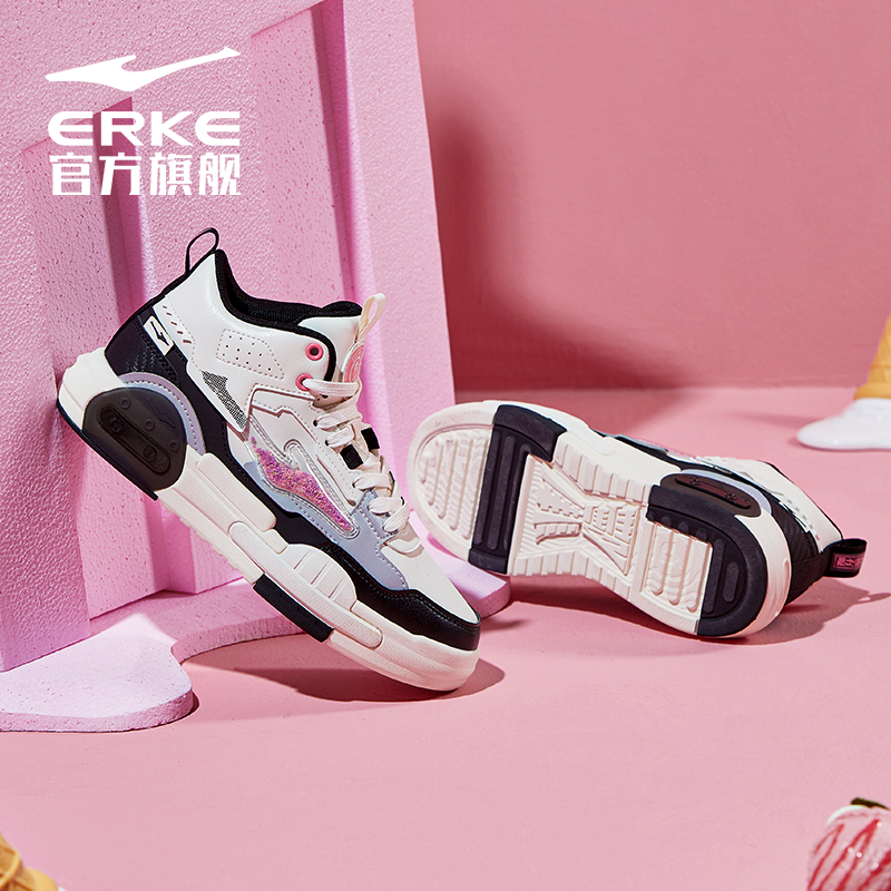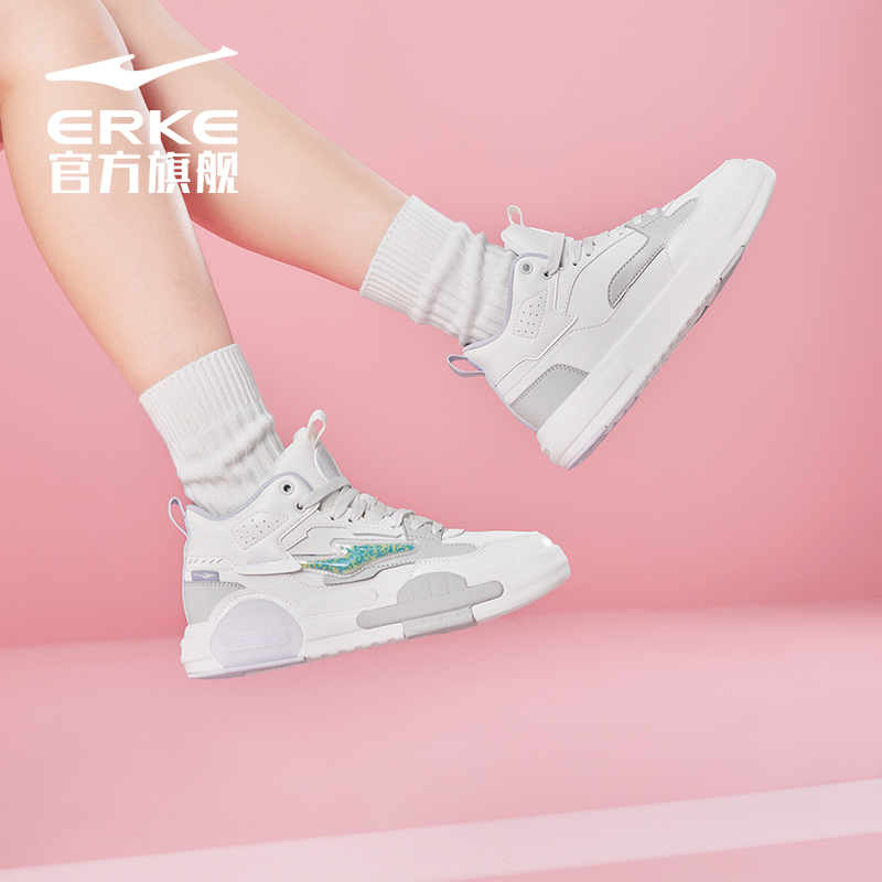 奶油鸿星尔克女鞋高帮板鞋新款白色休闲鞋潮厚底运动鞋子滑板鞋女