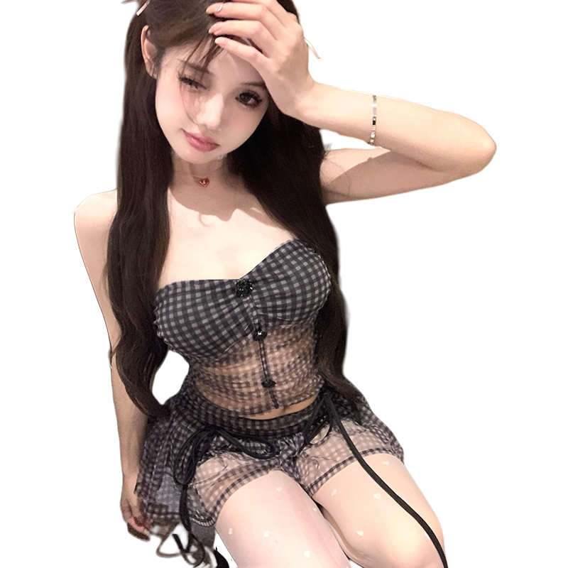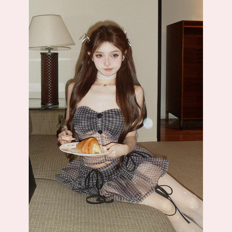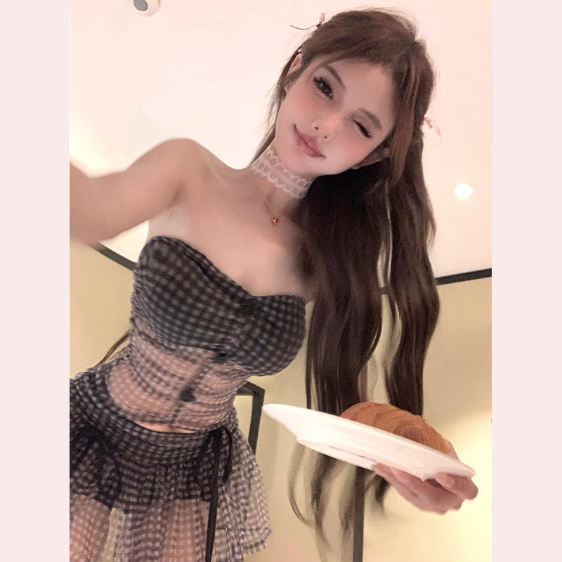 【TiTi美少女】复古格子短款抹胸背心上衣女春网纱半身短裙两件套