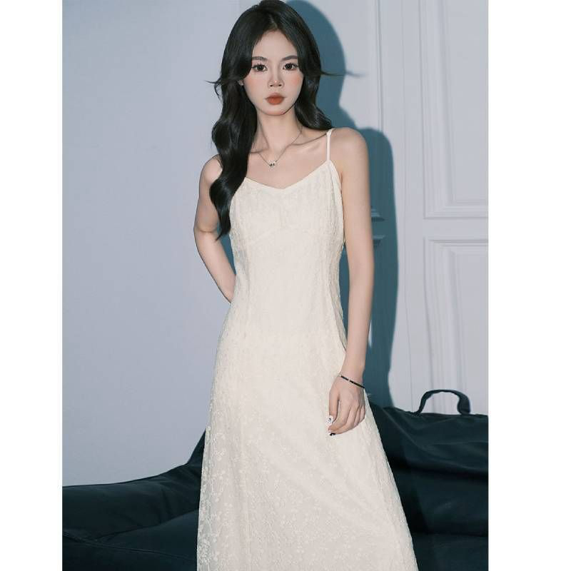 法式杏色蕾丝钩花吊带连衣裙女A字绝美度假风仙女长裙子夏季新款