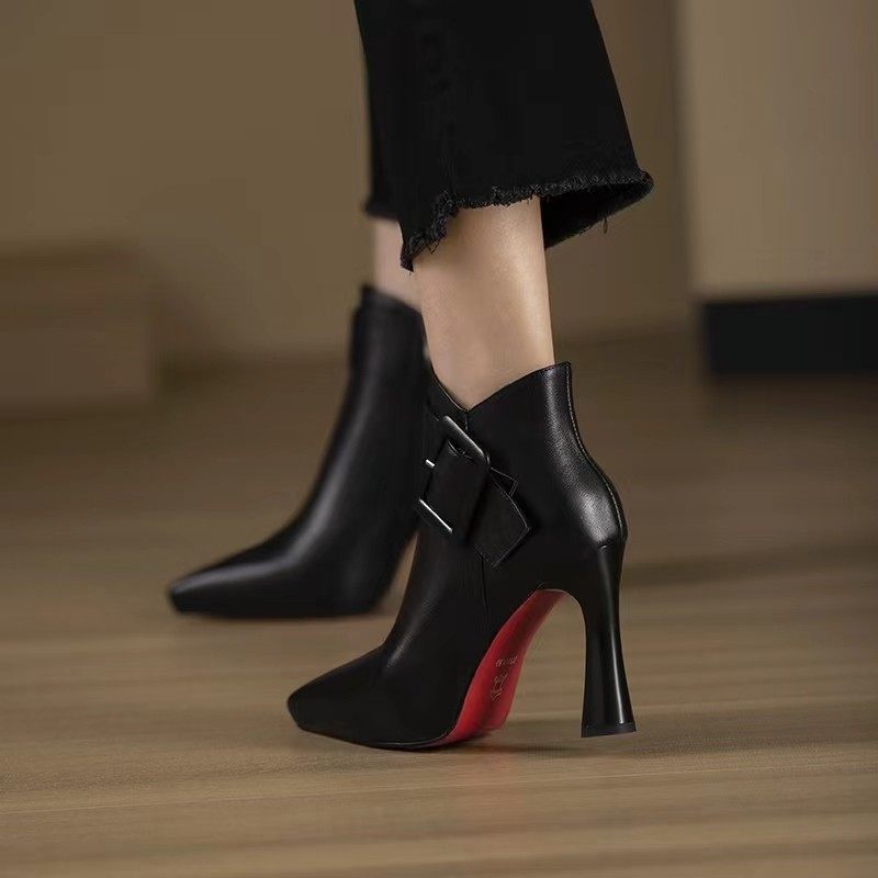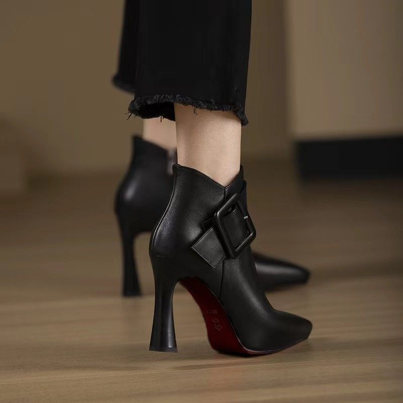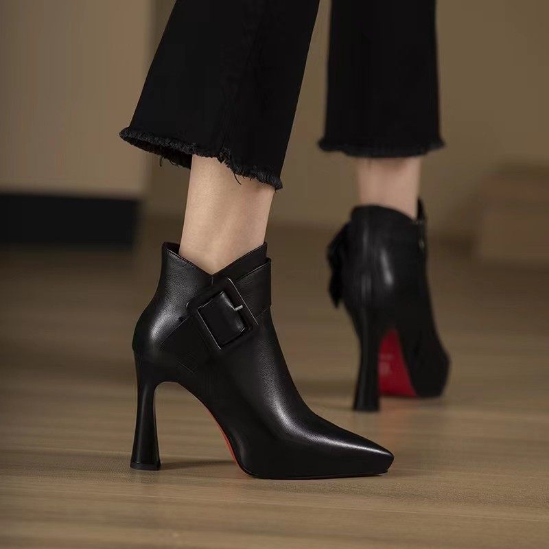 舒适柔软高跟真皮短靴2025秋冬加绒女靴尖头防水台厚底粗跟马丁靴