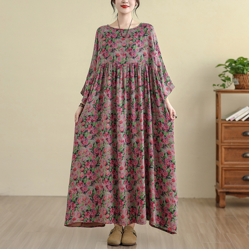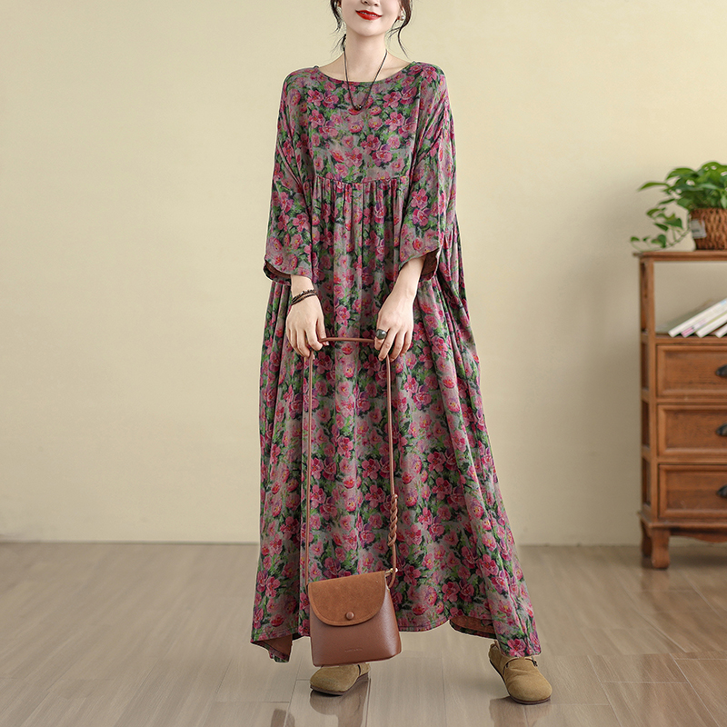长袖大码可穿200斤复古百搭数码印花加厚长裙棉麻连衣裙子胖mm