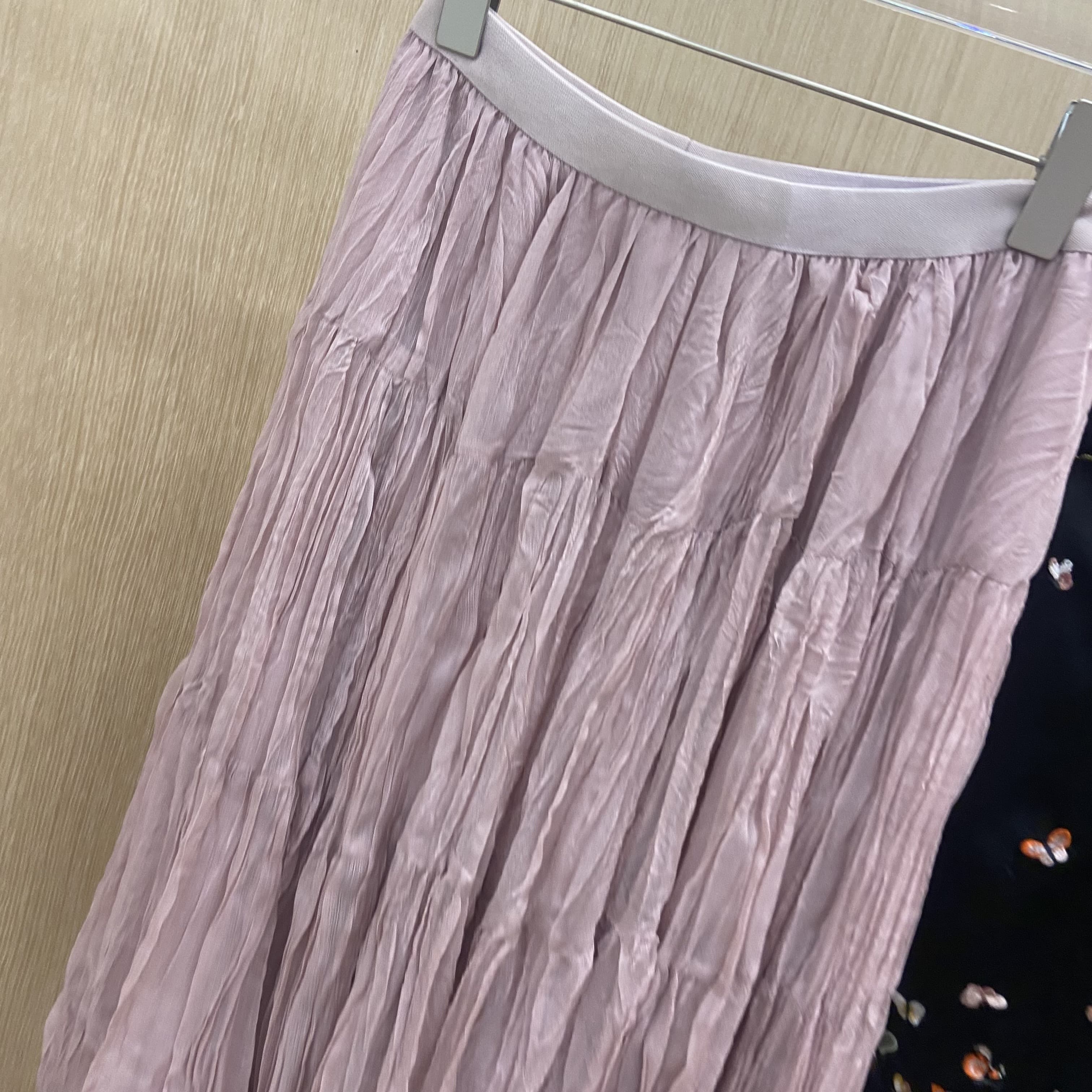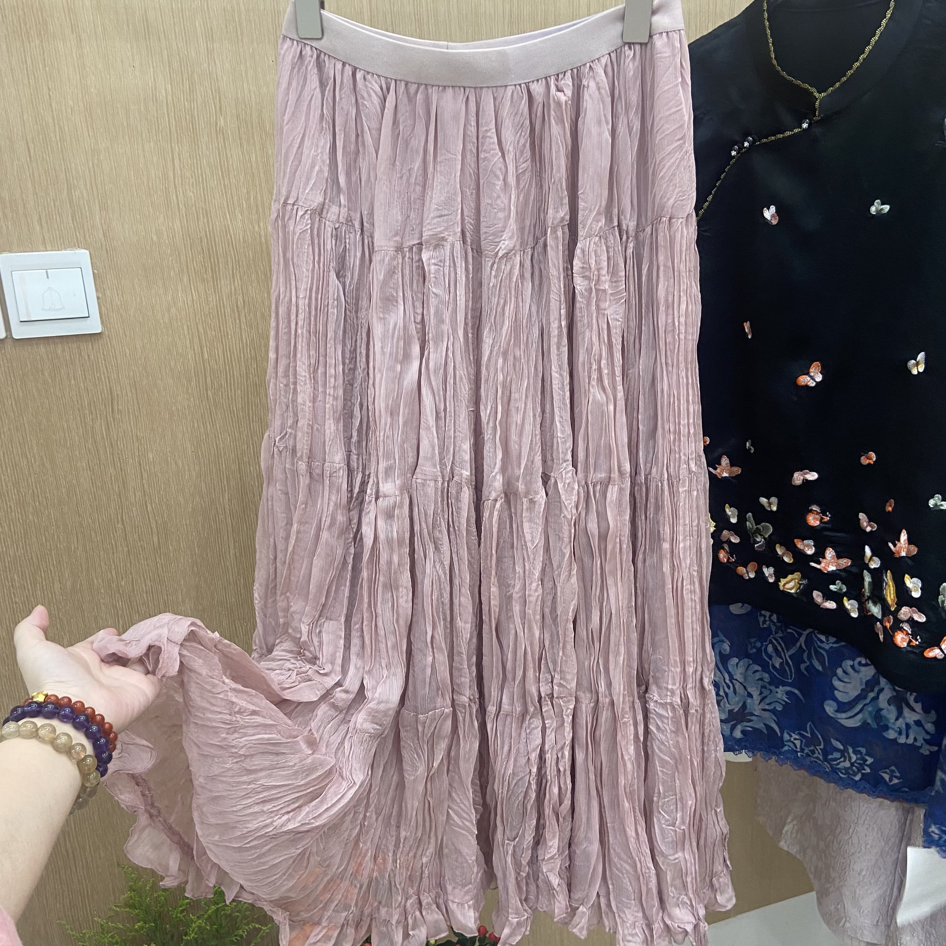 洋气松紧腰粉红色褶皱长款女半身裙飘逸仙女裙夏设计感纱裙长裙