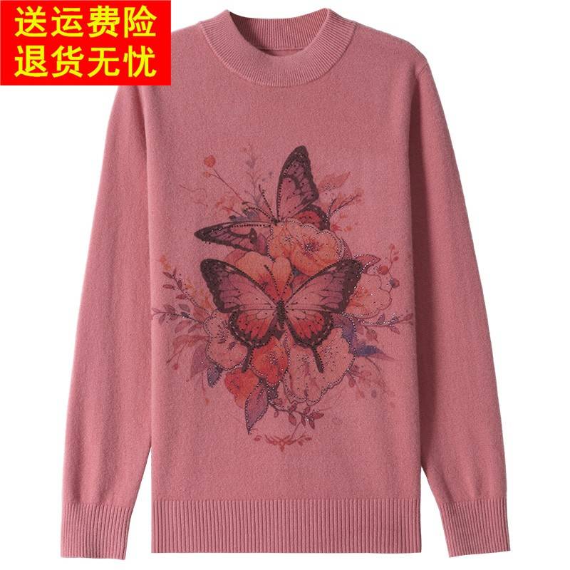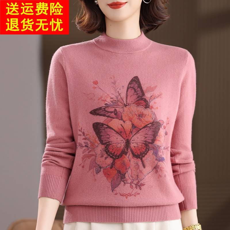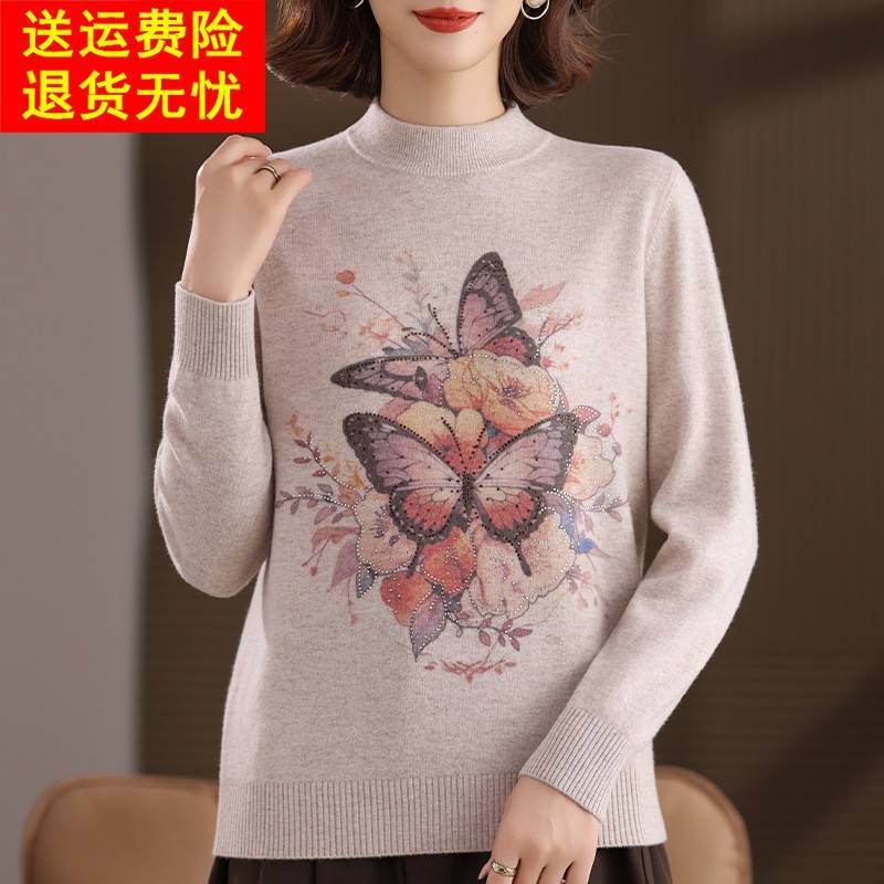 洋气妈妈装半高领100纯羊毛绒针织打底衫女秋冬新款蝴蝶印花毛衣