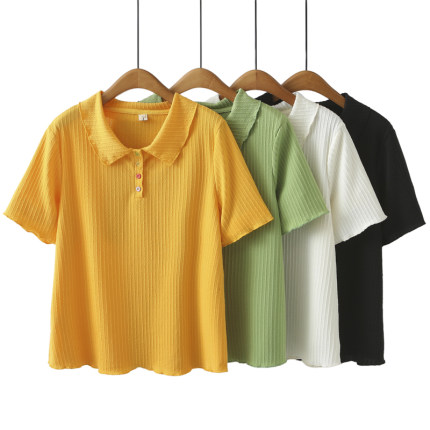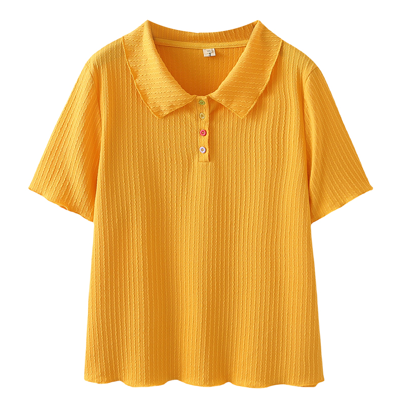 大码女装新款韩版短袖肌理感T恤夏季宽松显瘦娃娃领彩色扣子上衣