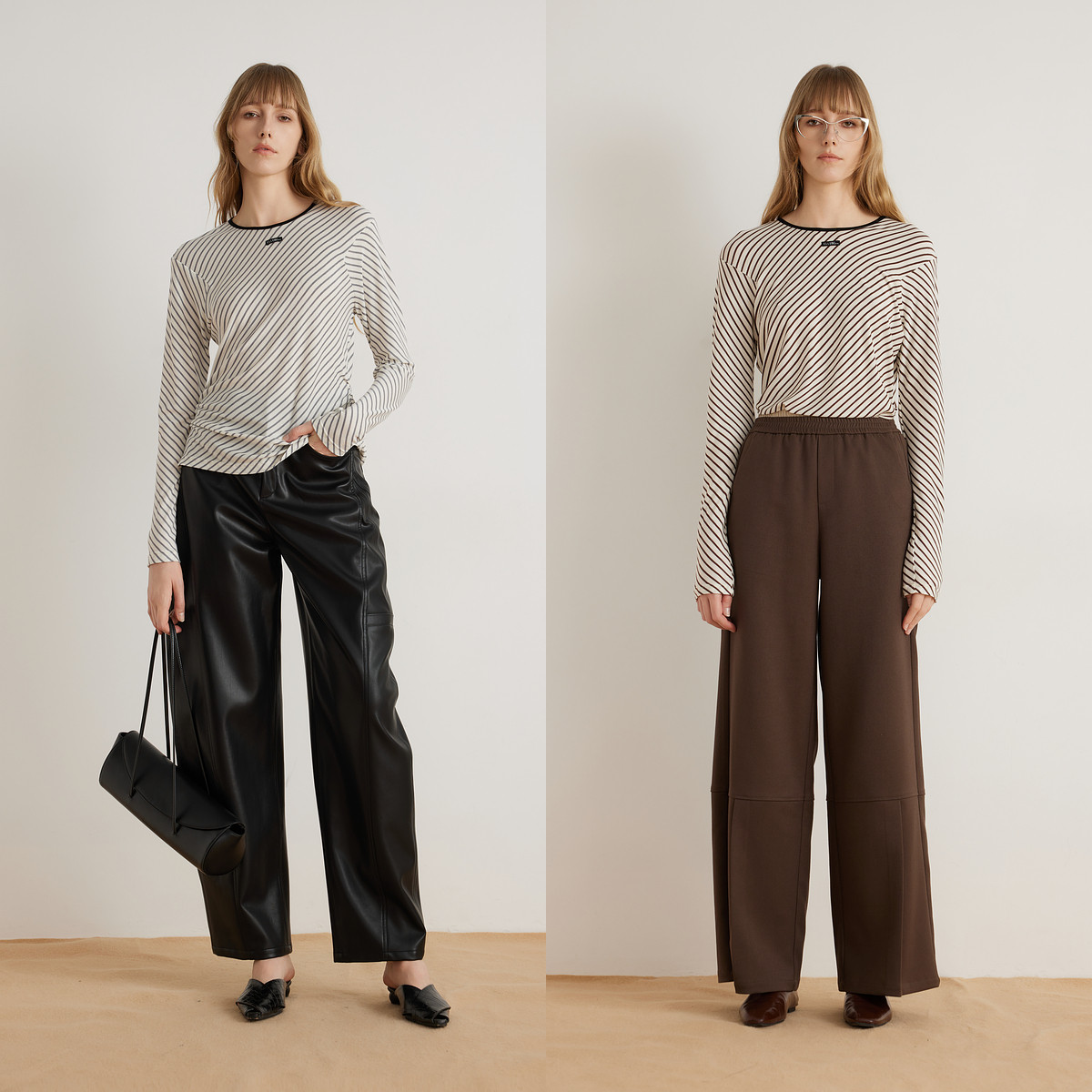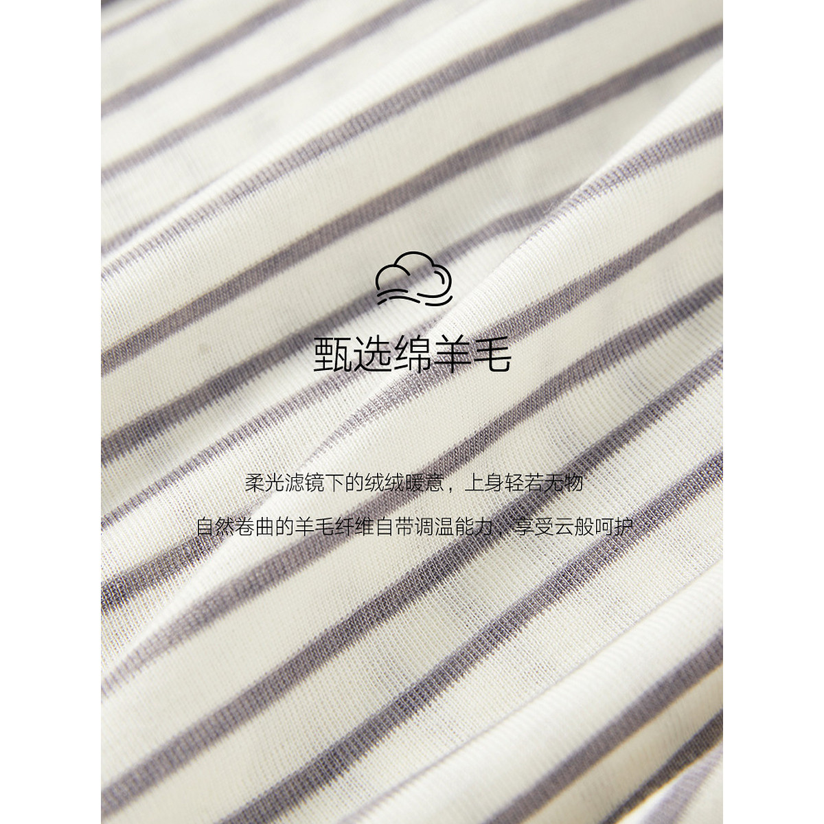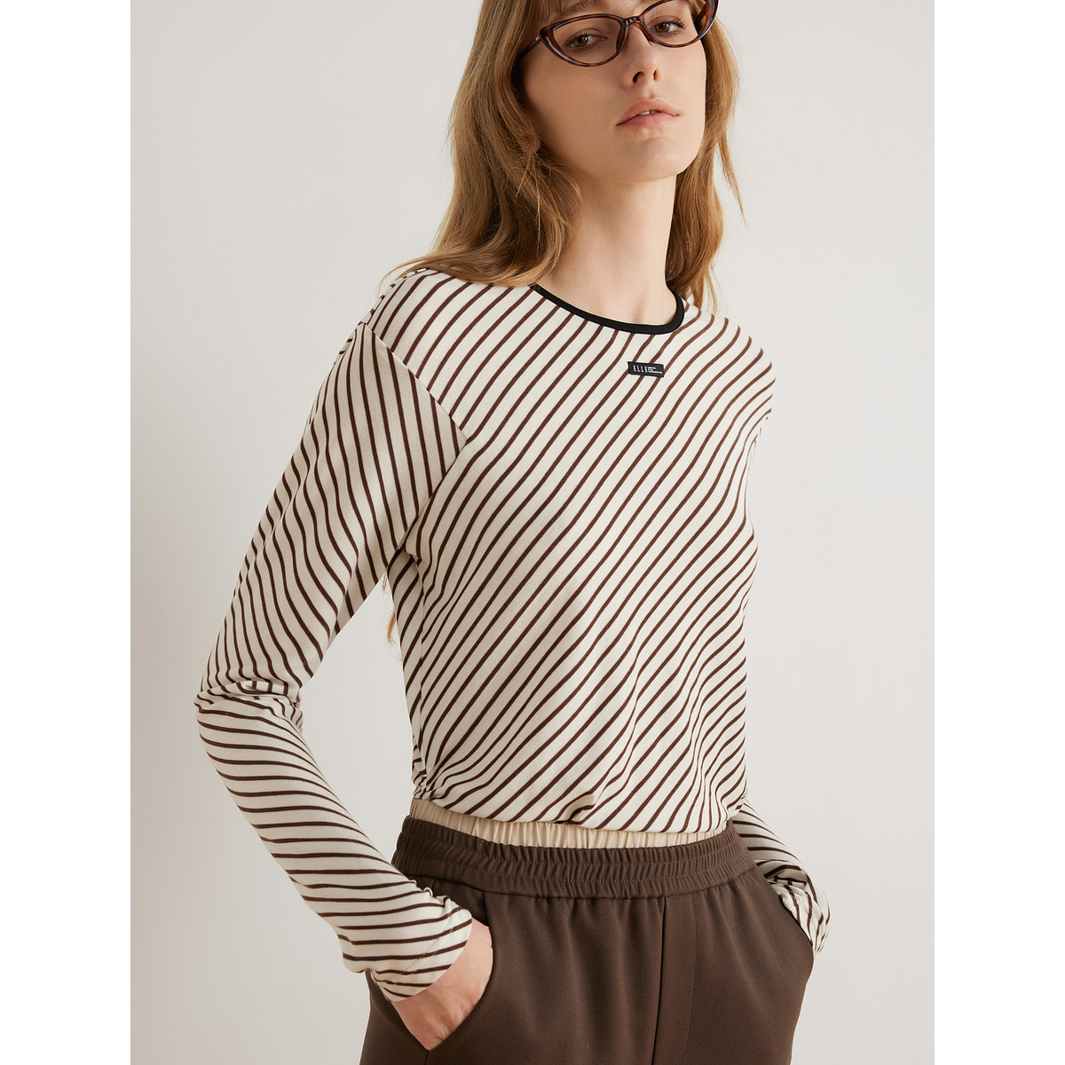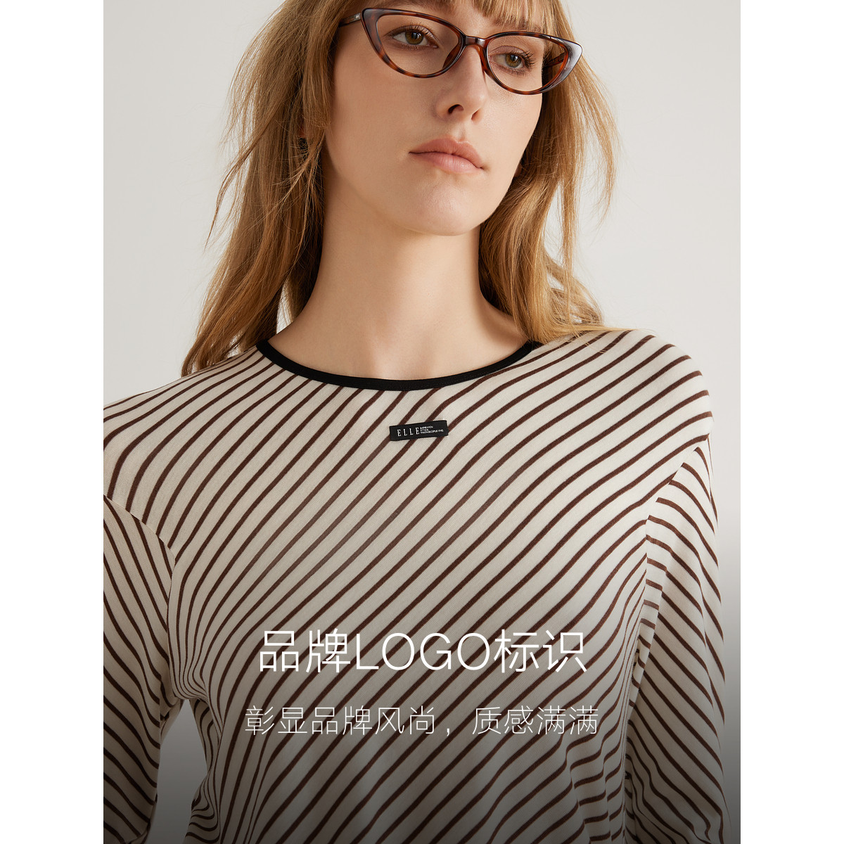 【商场同款】ELLE莱赛尔天丝条纹T恤女2025冬新款绵羊毛修身上衣