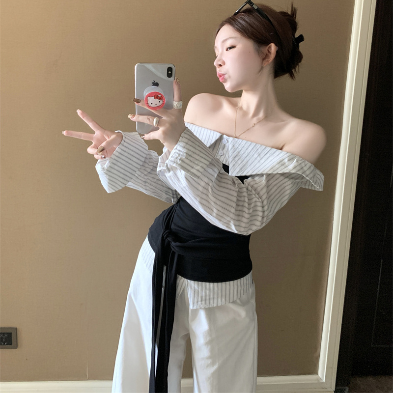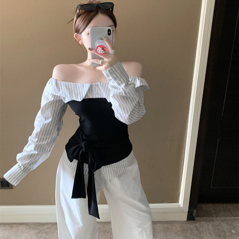 美式复古一字肩拼接t恤女夏季假两件短袖修身显瘦绑带露肩上衣潮