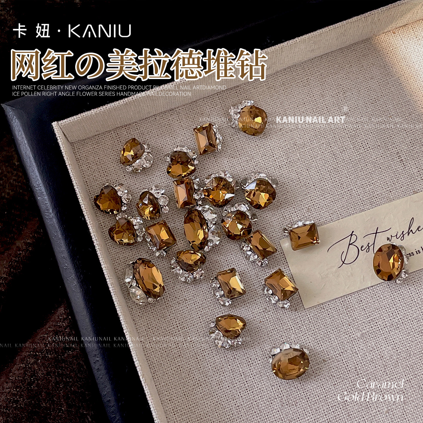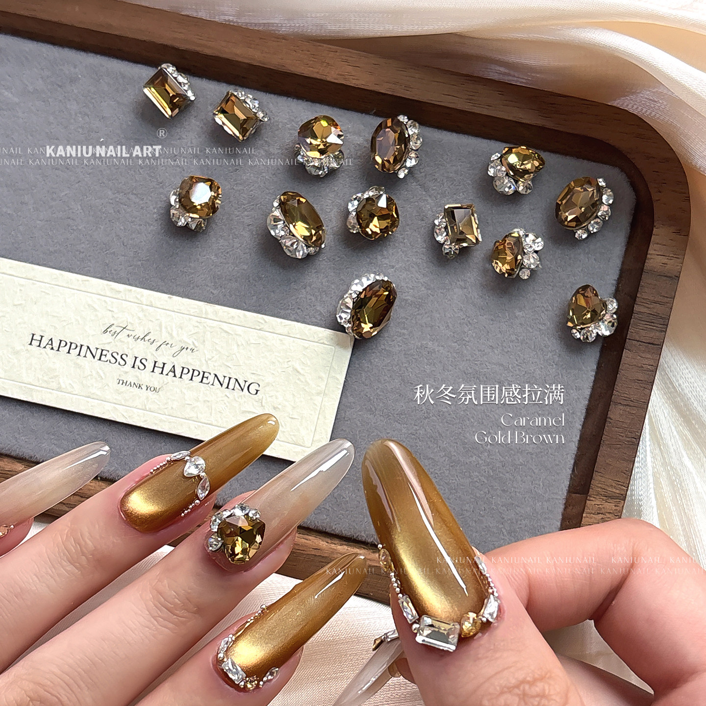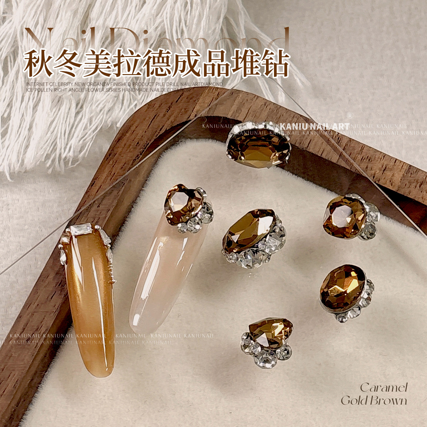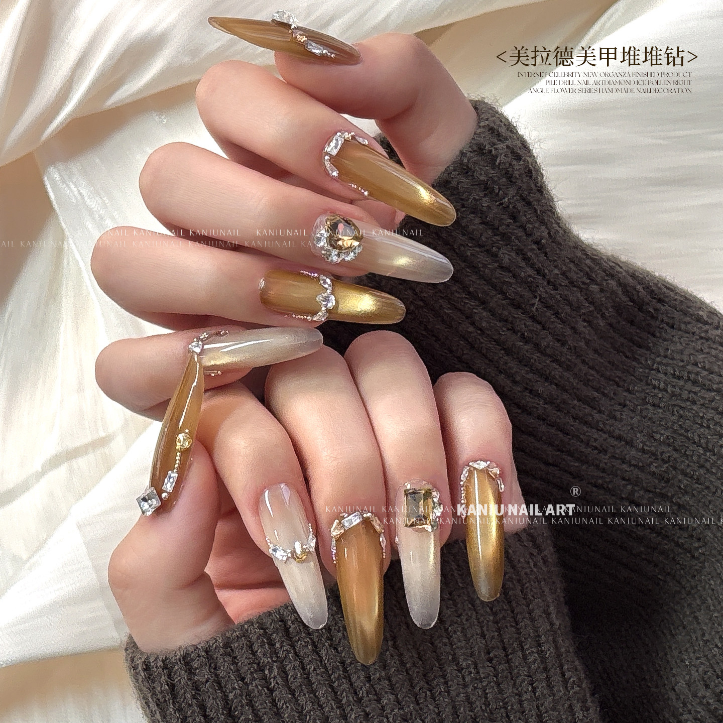 秋冬美拉德成品堆钻美甲网红爆闪焦糖香槟长方直角鸽子蛋指甲装饰