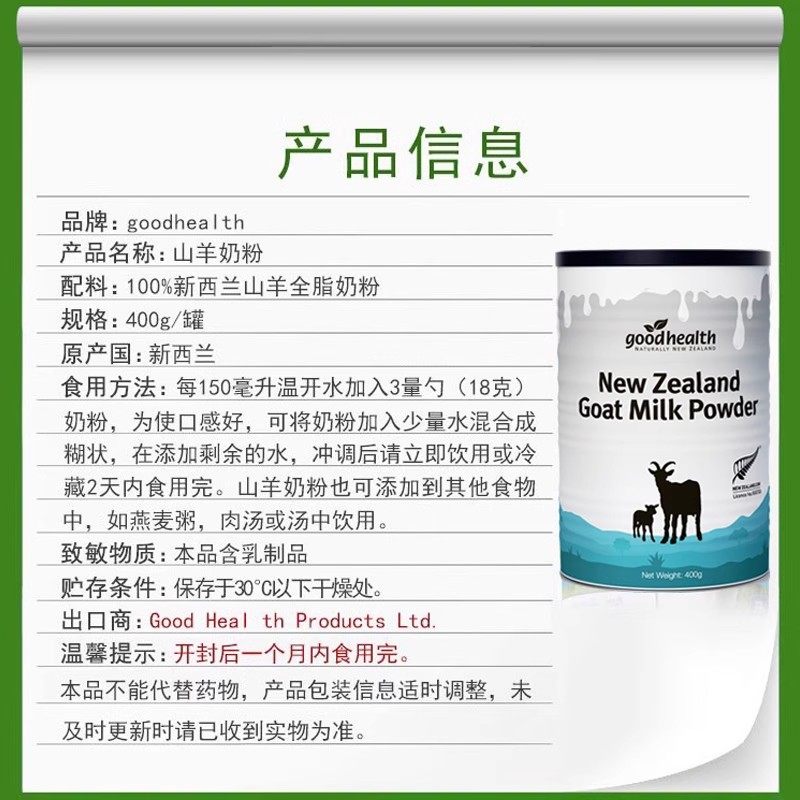 新西兰进口Goodhealth好健康纯山羊奶粉400g青少中老年人高钙无糖