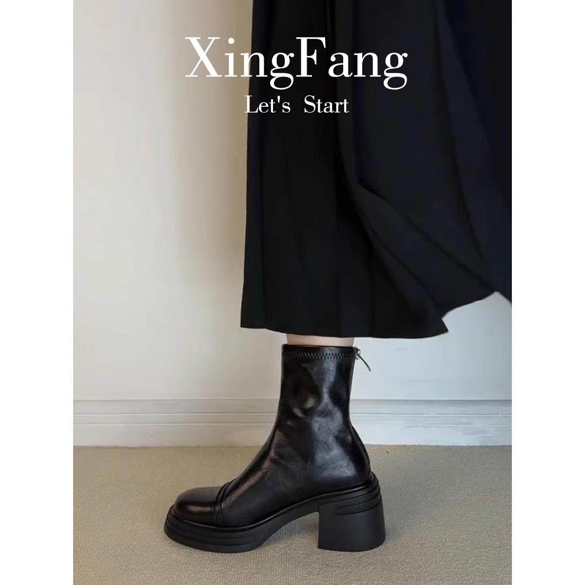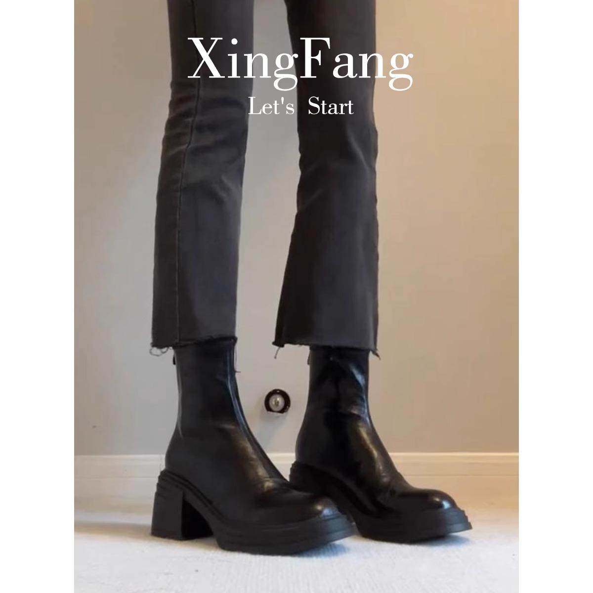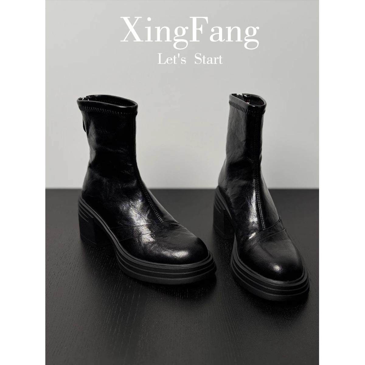 牛皮版~厚底短靴女2025新款秋冬复古显瘦高跟瘦瘦靴粗跟马丁靴子