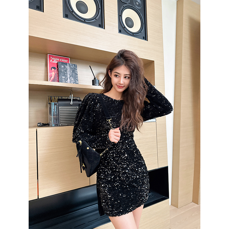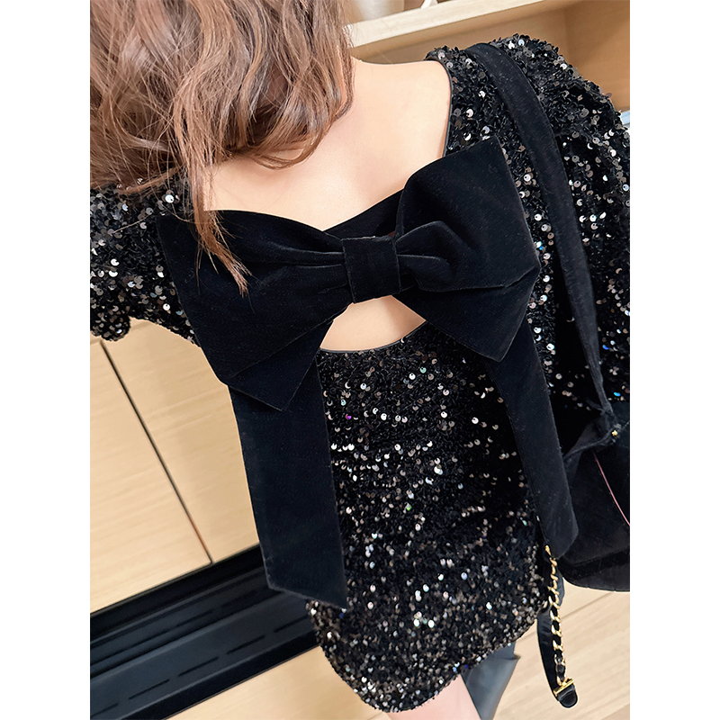 [现货]Forevercan女装新款名媛风气质LM亮片蝴蝶结露背丝绒连衣裙