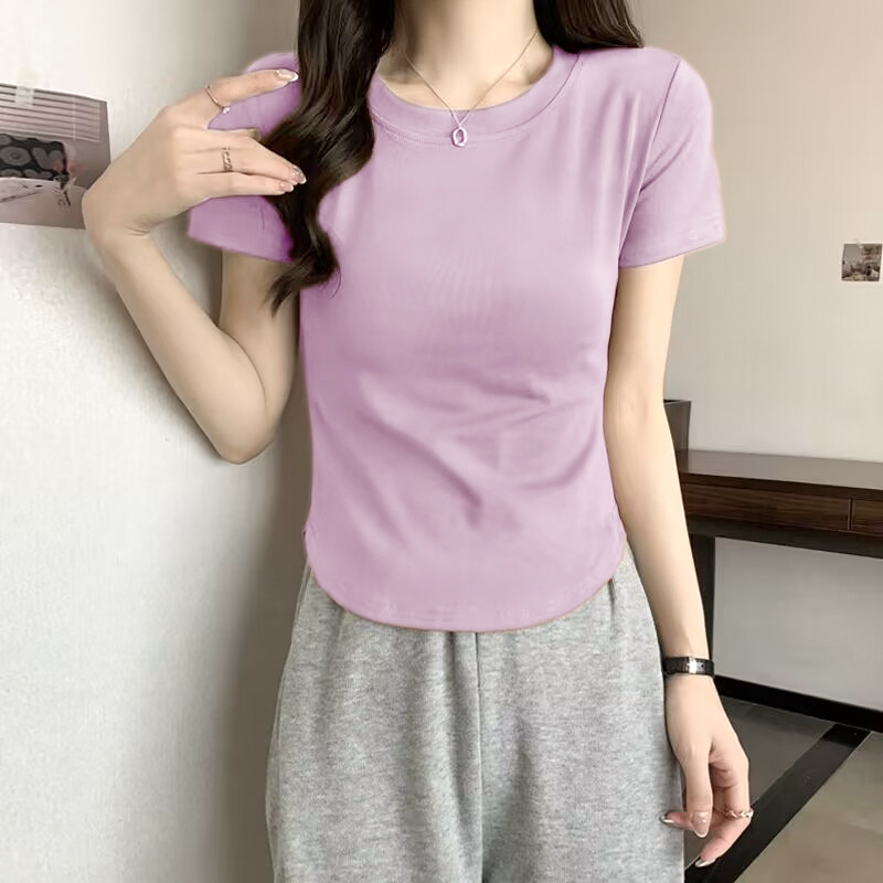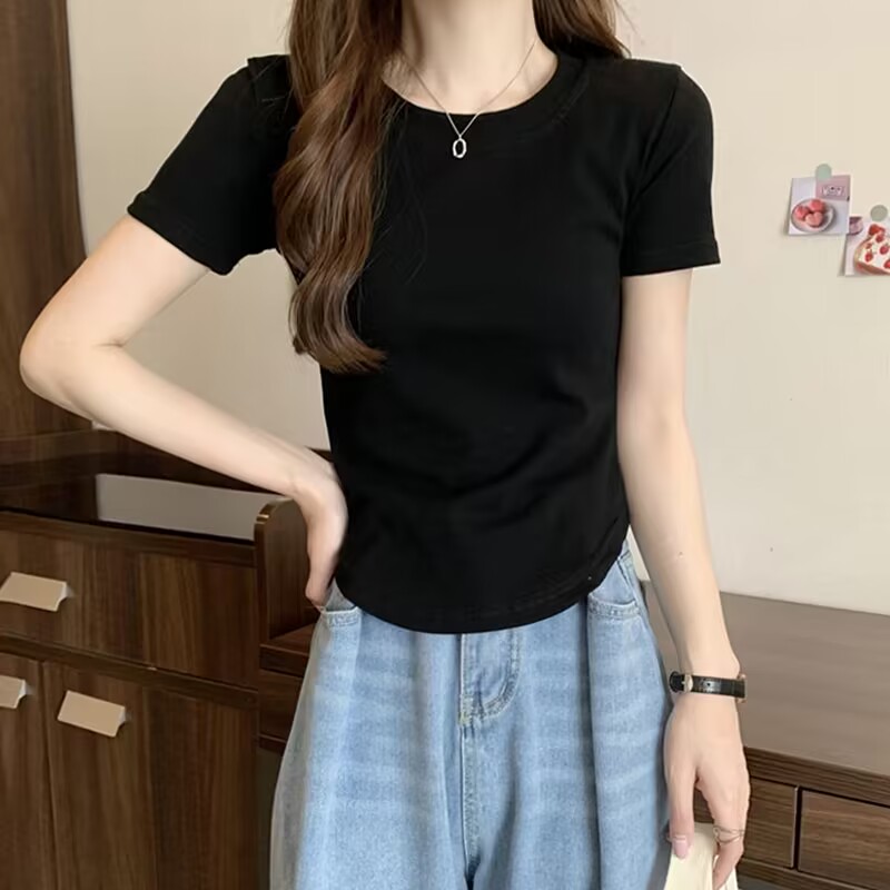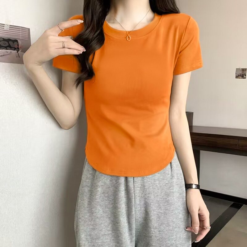 螺纹棉短袖正肩圆领纯色t恤女夏季时尚下摆圆弧修身显瘦百搭上衣