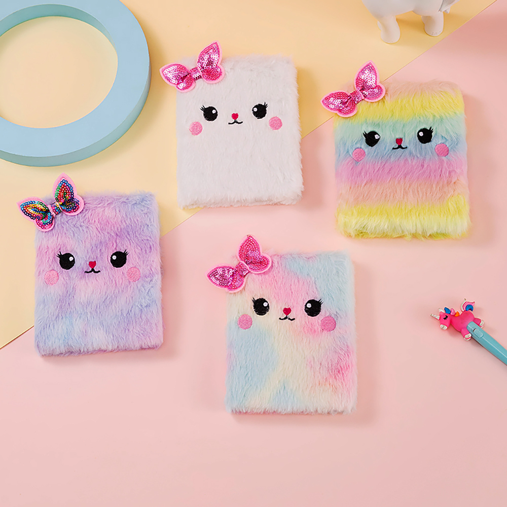 少女新款彩虹色蝴蝶结毛绒笔记本学生书写手账本儿童小号日记本女
