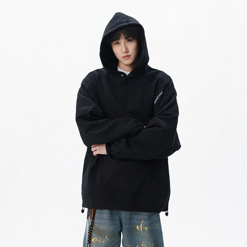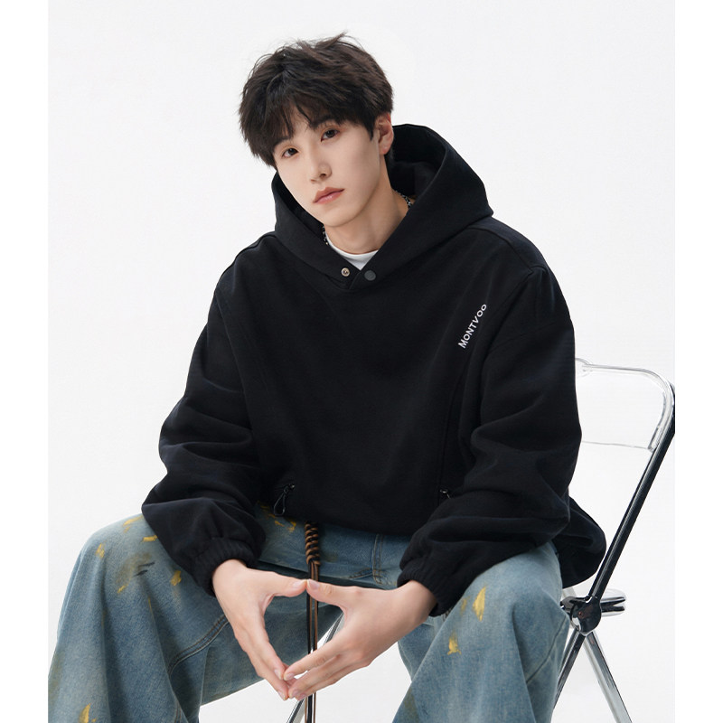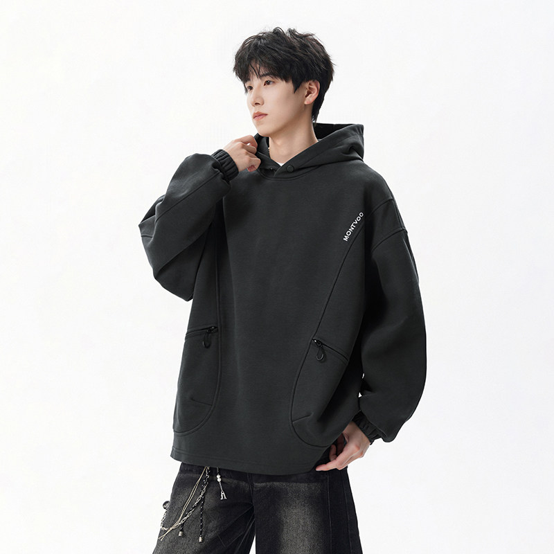 迈特优美式拉链口袋连帽卫衣男春季新款潮牌宽松运动黑色情侣帽衫