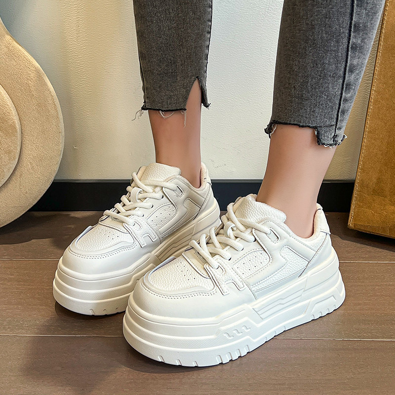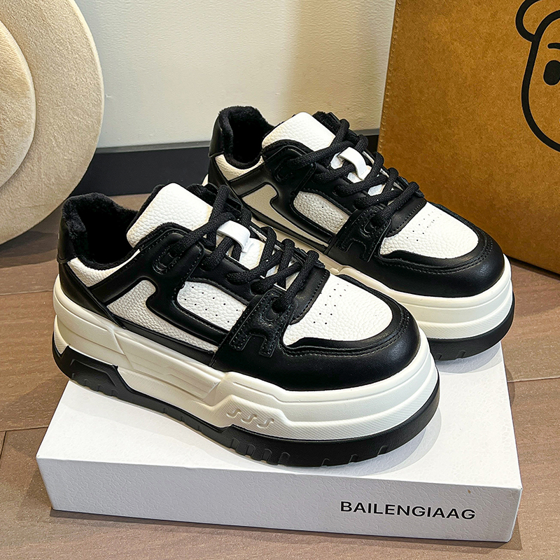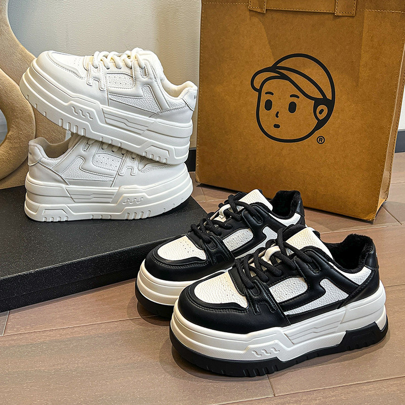欧货真皮松糕底小白鞋女2025春季新款熊猫色圆头休闲厚底增高板鞋