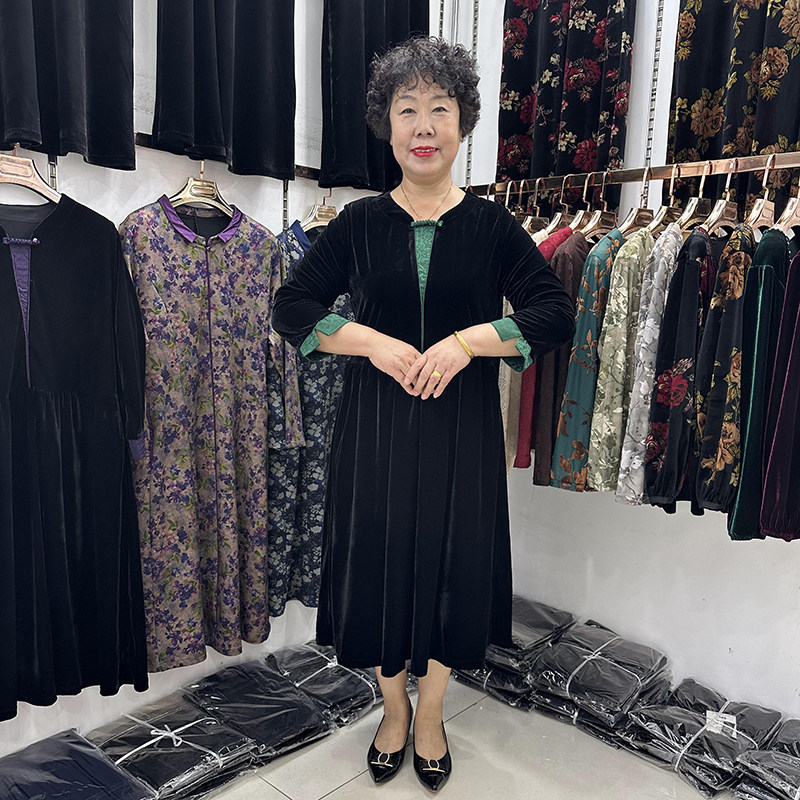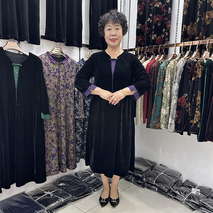 中年妈妈秋冬新款国风撞色真丝绒连衣裙女长袖拼色丝绒显瘦洋气装