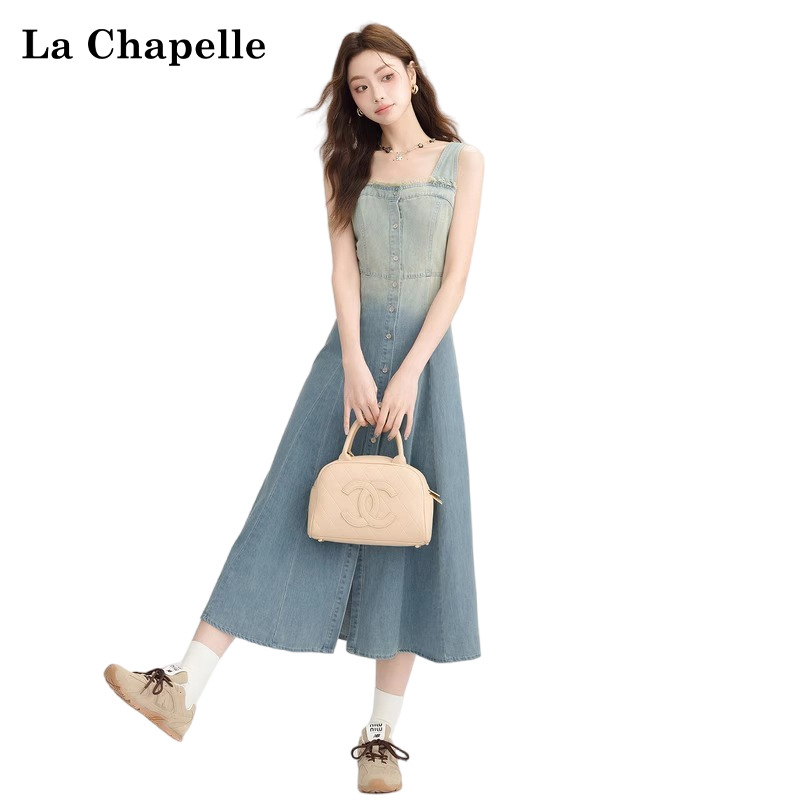拉夏贝尔气质渐变牛仔吊带连衣裙女2025夏季新款设计感背带长裙