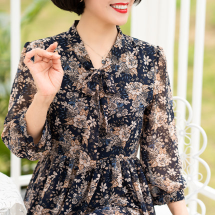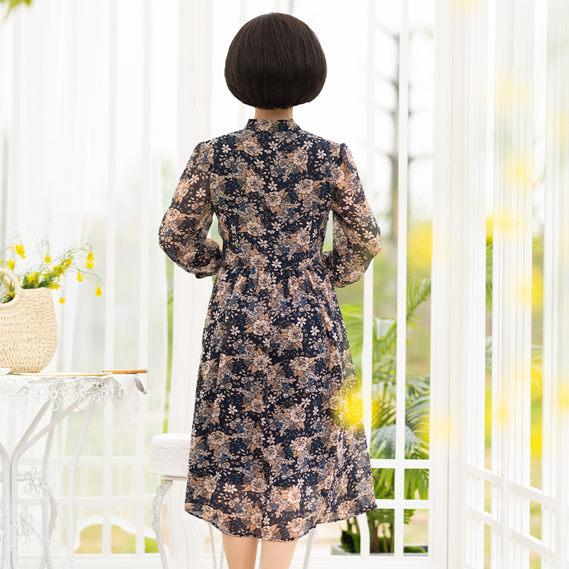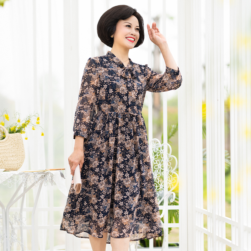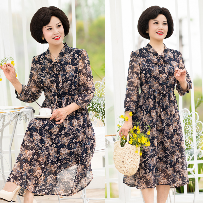 母亲节妈妈夏装连衣裙2021新款中袖高贵碎花洋气雪纺中长款裙子