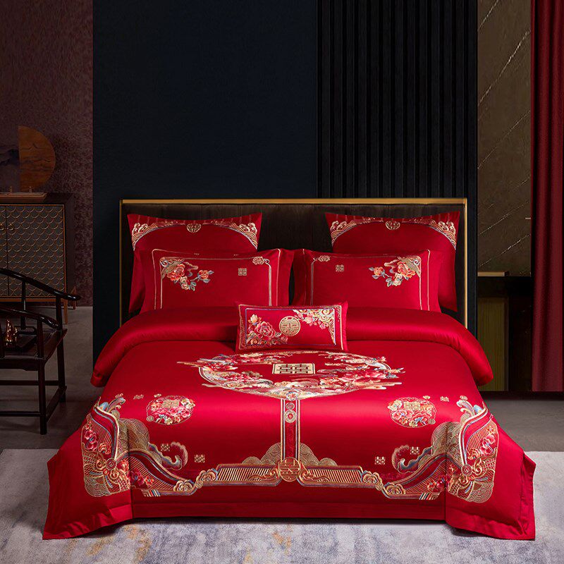 100%全棉中式婚庆四件套新婚纯棉床单被套大红S色结婚房床上用品4