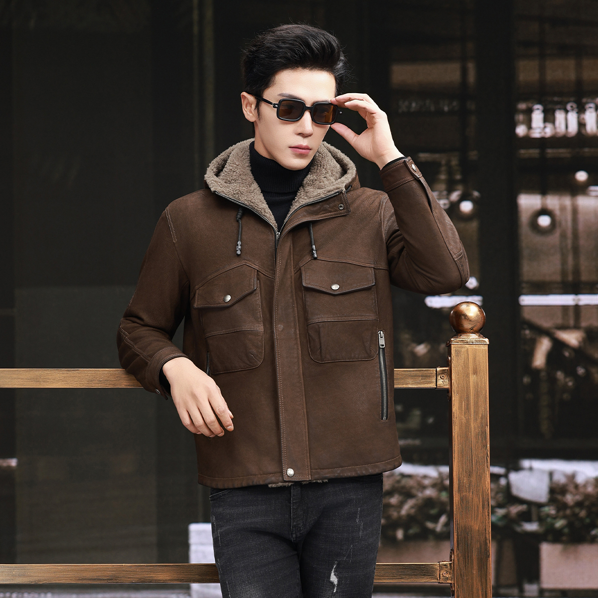 秋冬新款真皮皮衣男羊毛连帽短款山羊皮夹克保暖皮毛拼接一体外套