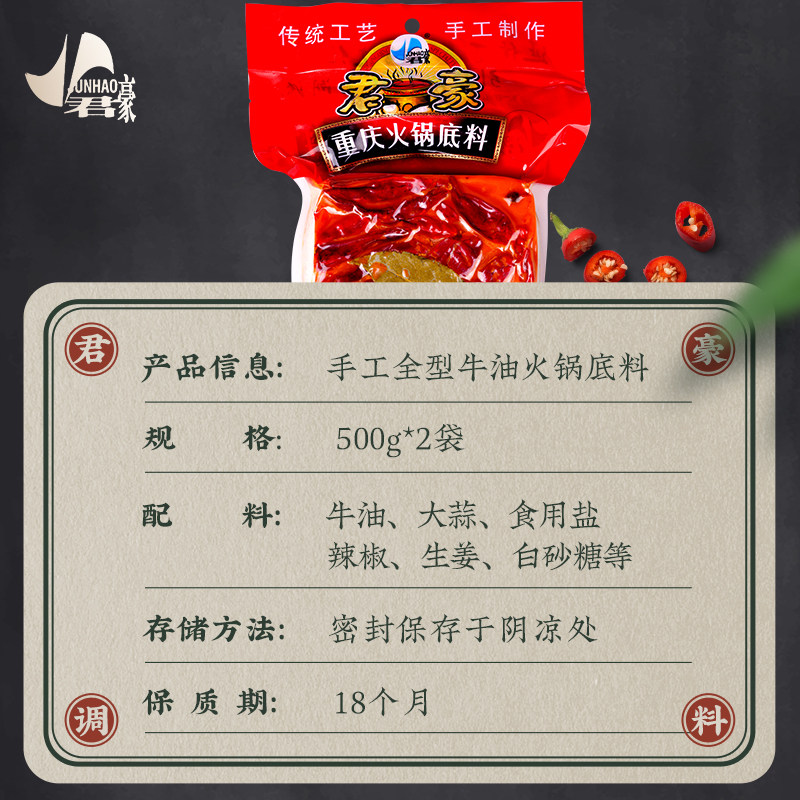 重庆火锅底料500g*2袋君豪牛油手工火锅调料红油底料火锅底料中辣