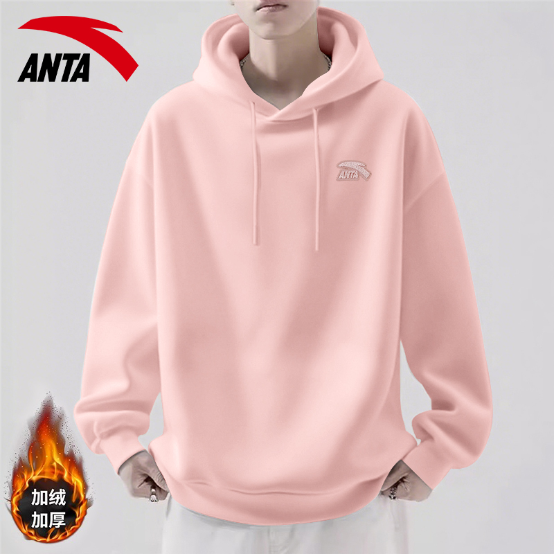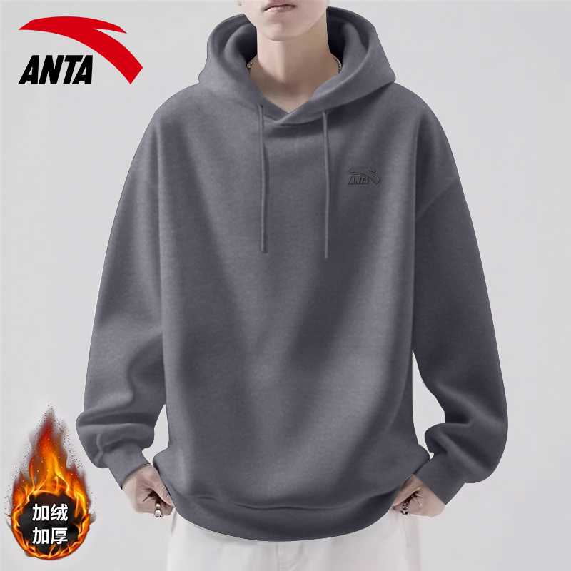 安踏加绒连帽卫衣男冬季保暖红色青少年美式宽松休闲运动套头长袖