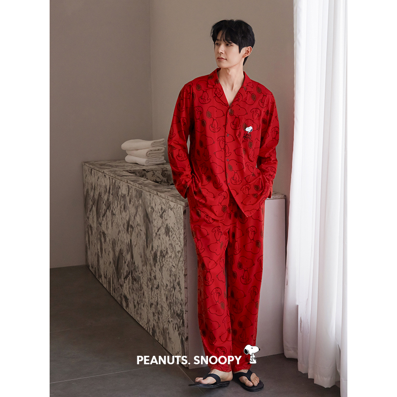 贝妍春秋季情侣睡衣柔软棉史努比长袖家居服男女喜庆红色结婚套装