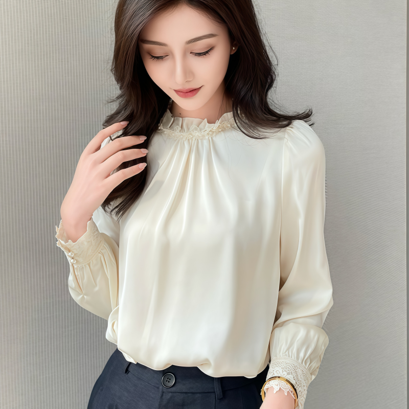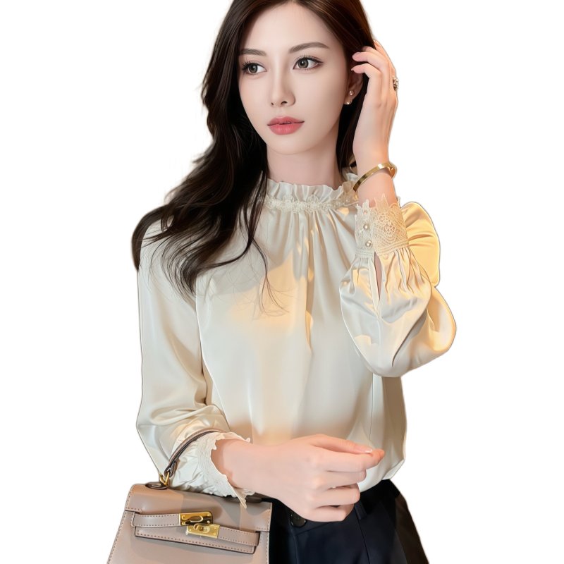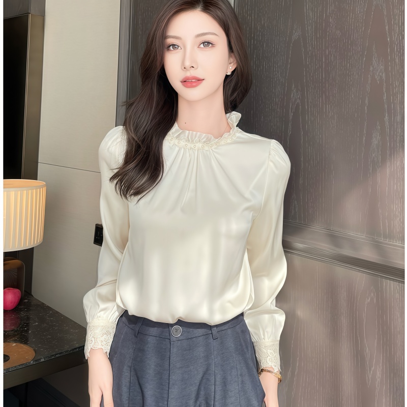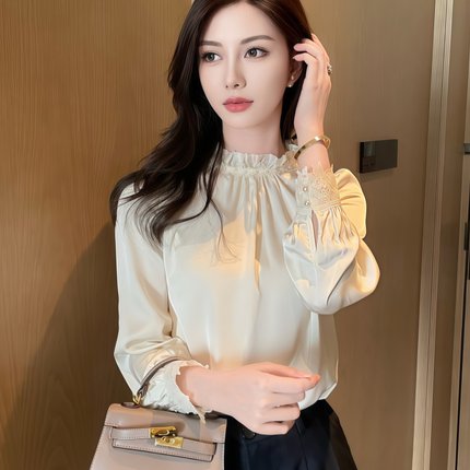 华来阿玛施特2025春季新款法式木耳边钉珠缎面衬衫女通勤长袖上衣