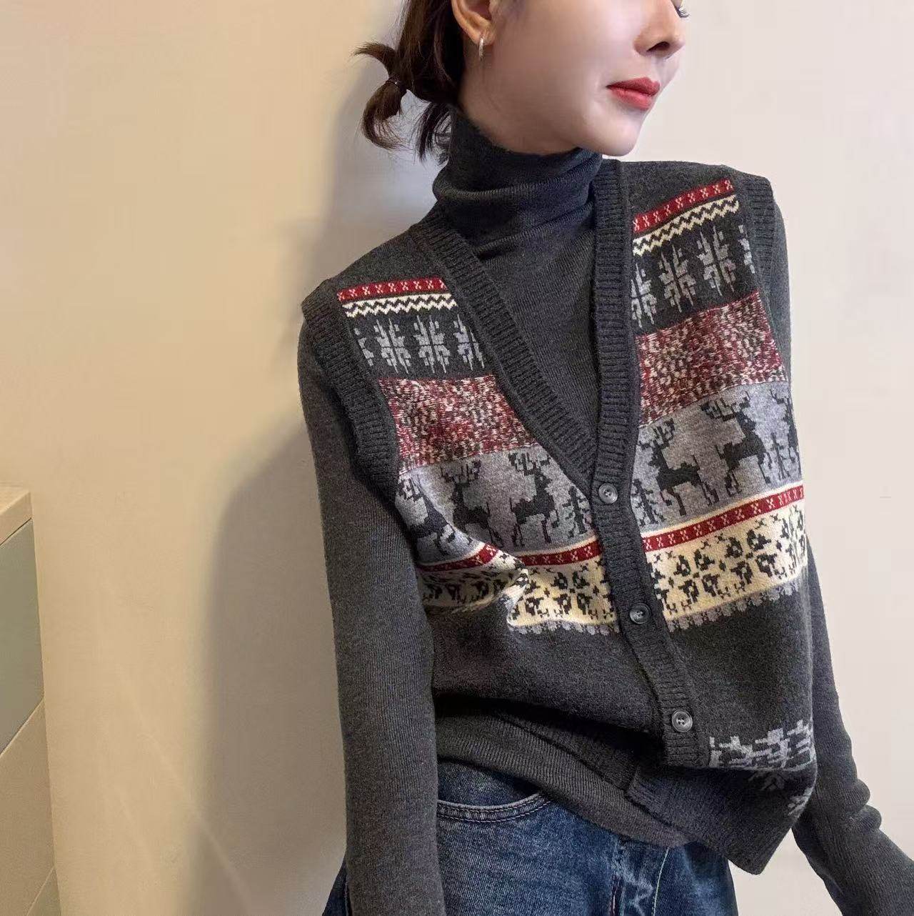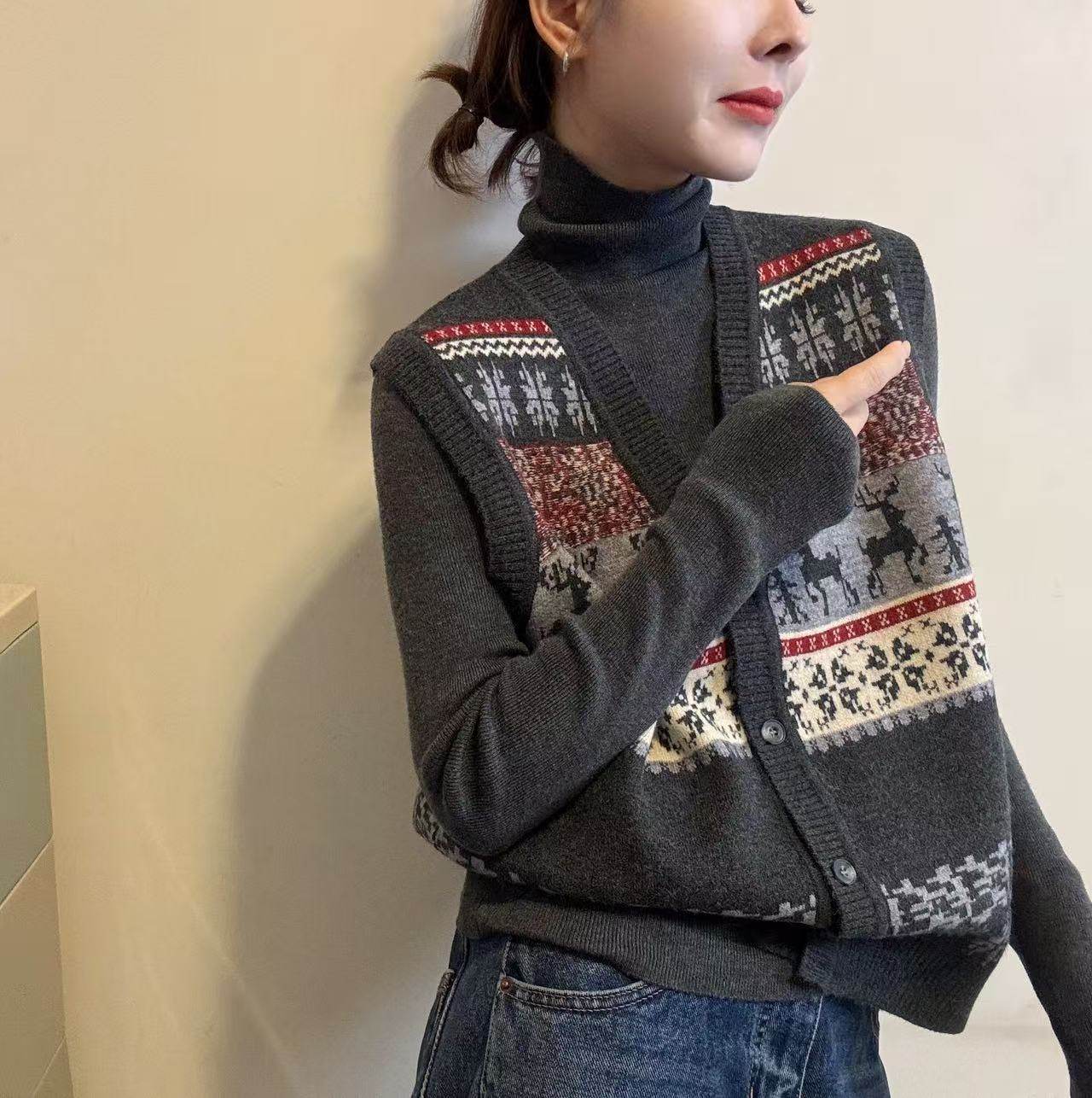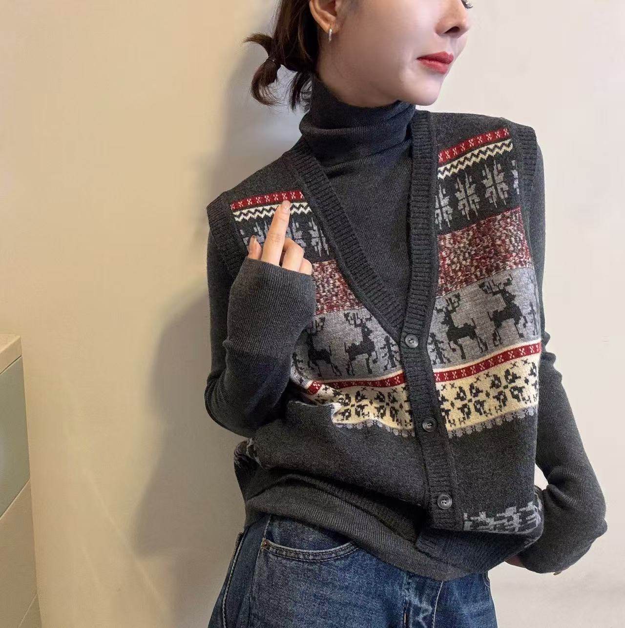 BADX正品25冬季灰色高领长打底上衣+卡通提花V领毛衣马甲两件套女