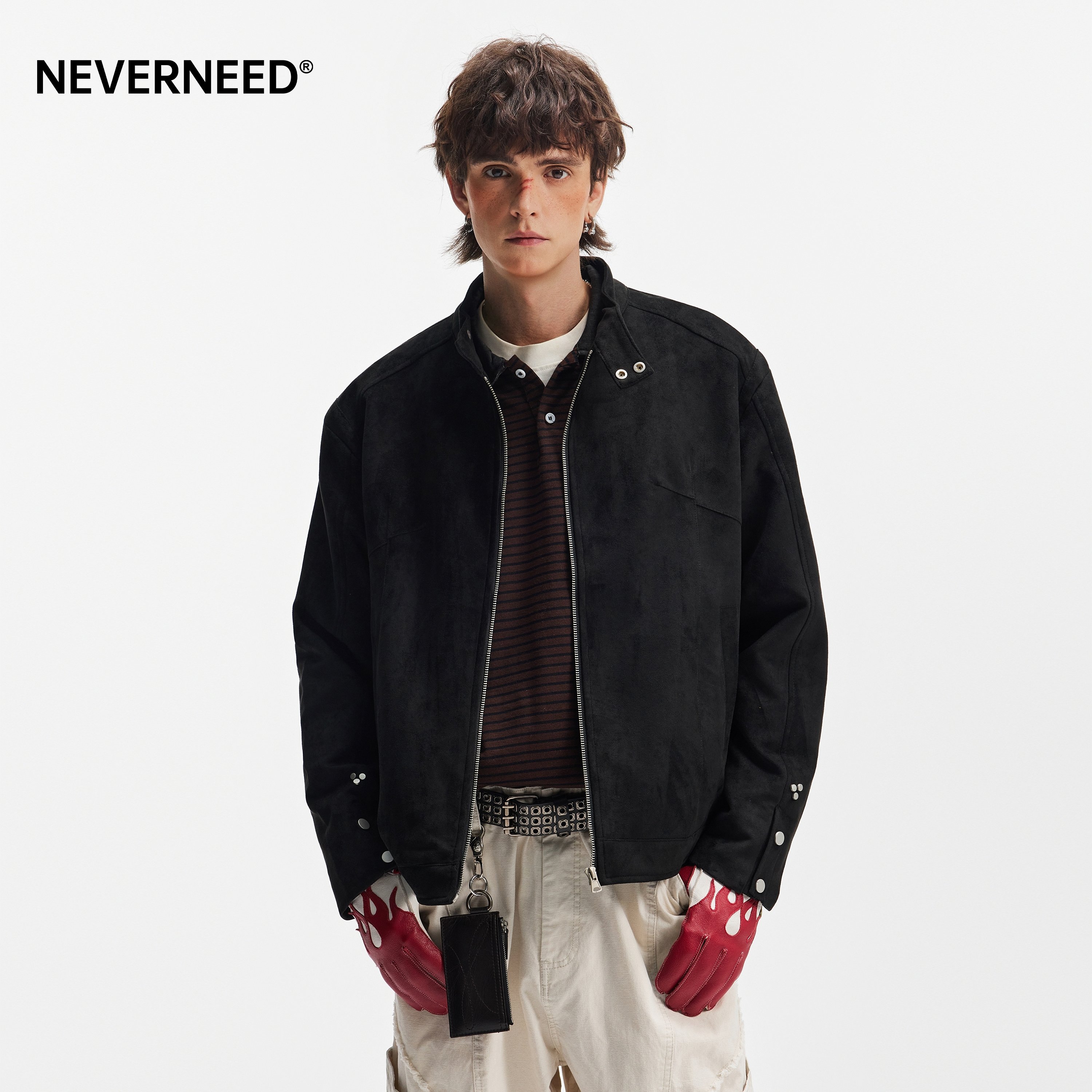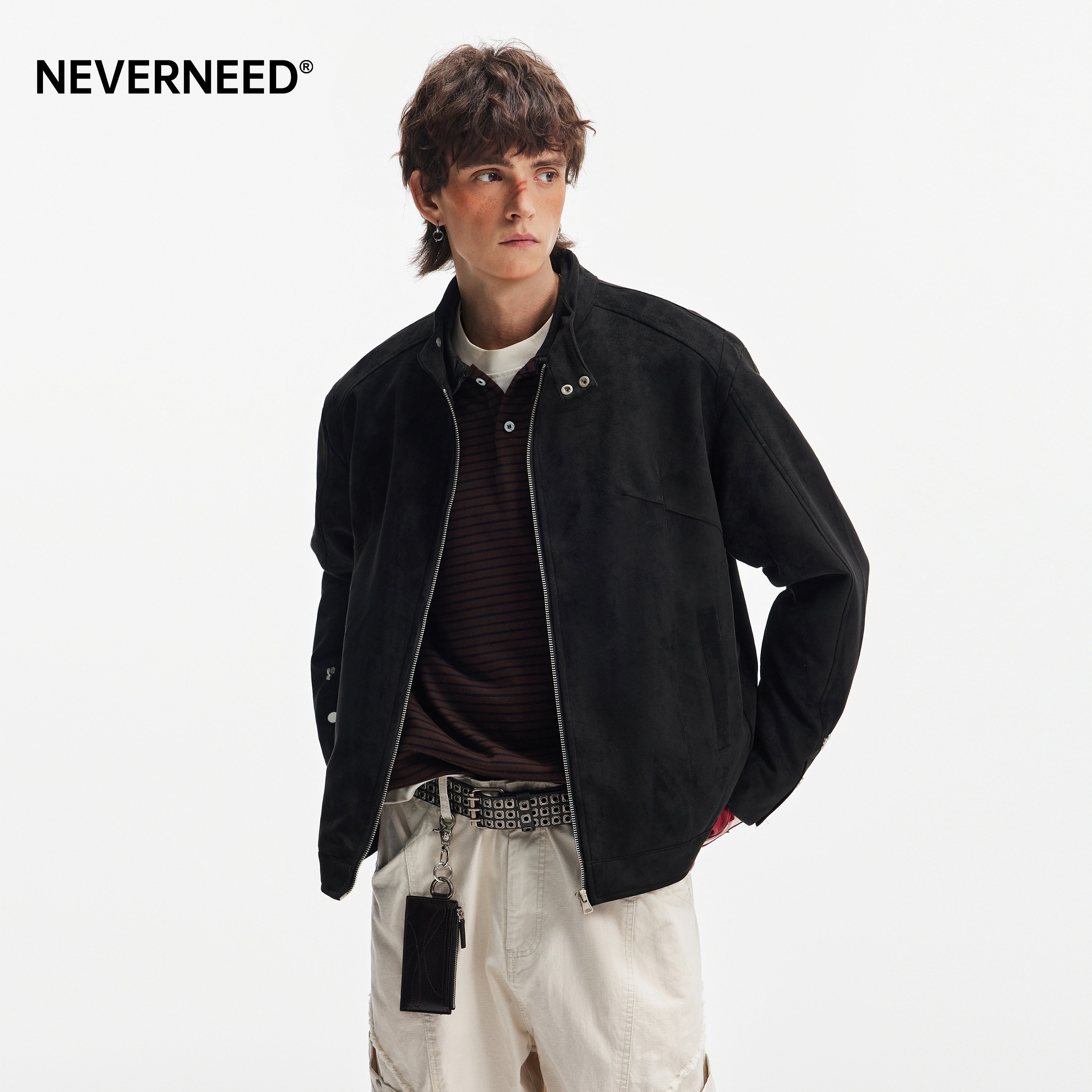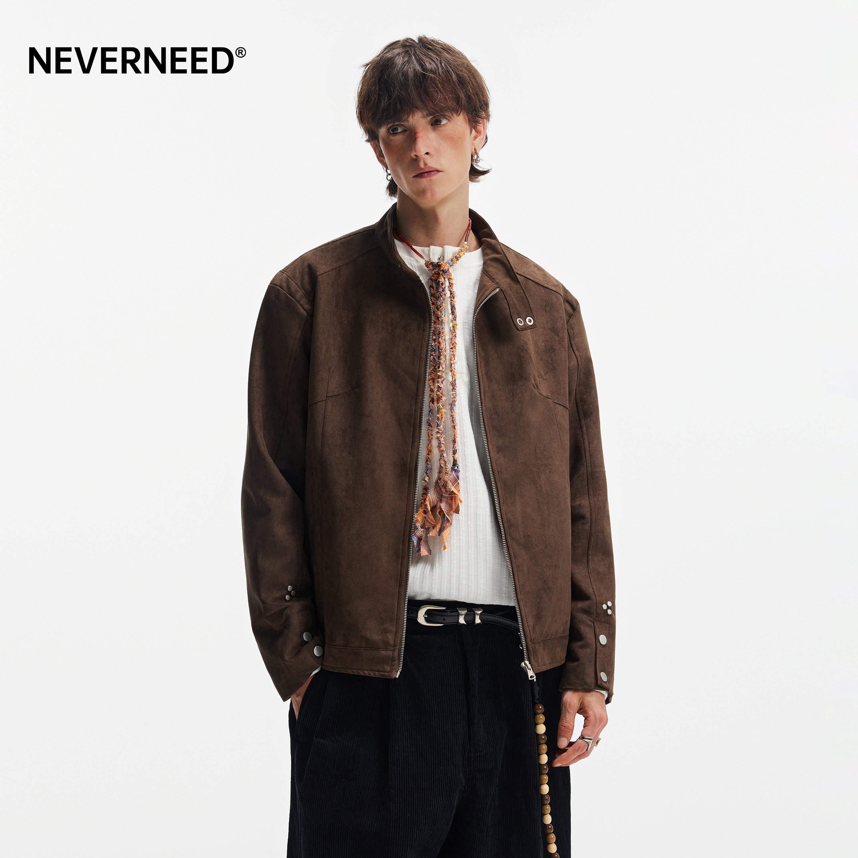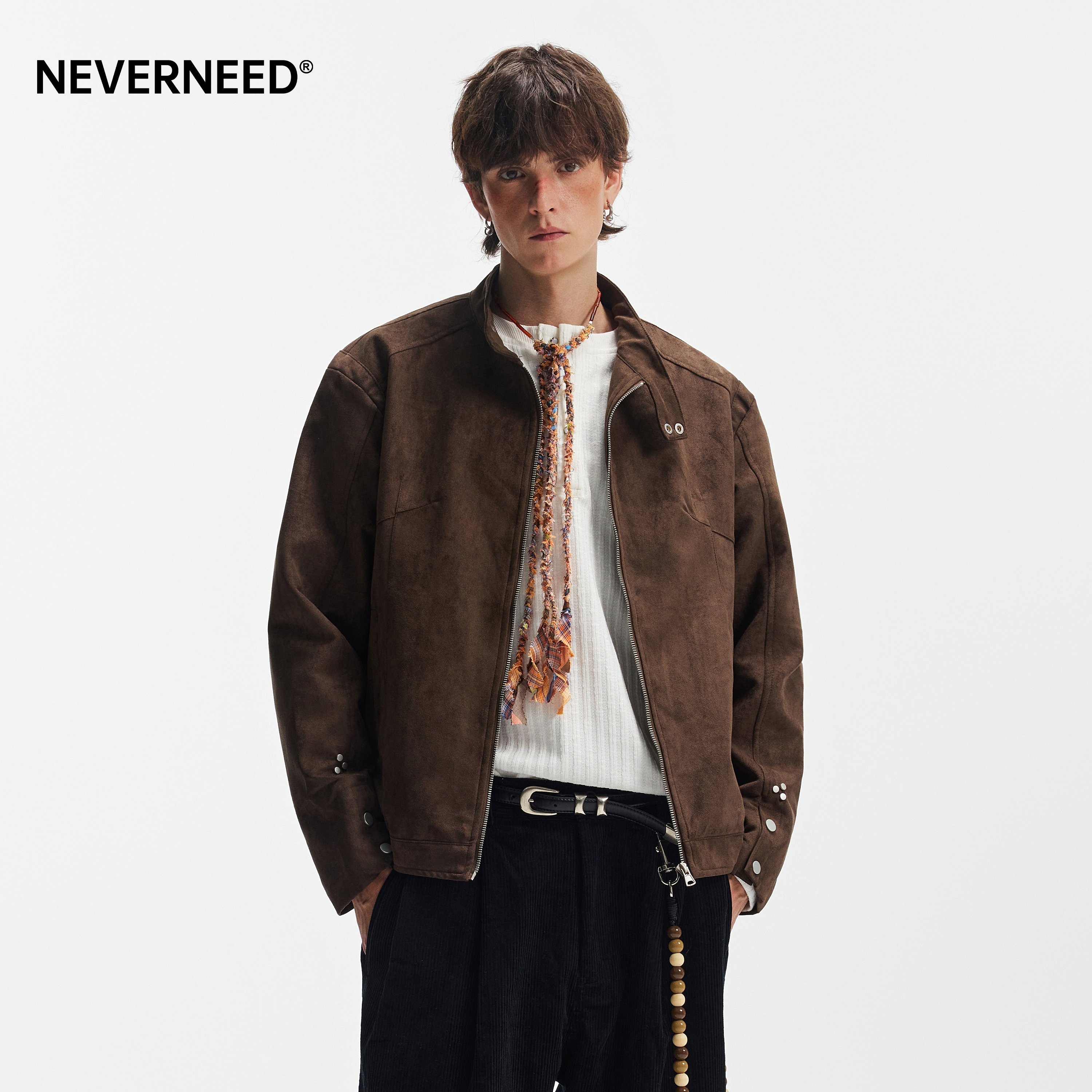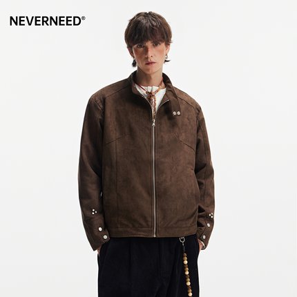 NEVERNEED棕色哈灵顿boxy短款夹克男美式cleanfit情侣麂皮绒外套