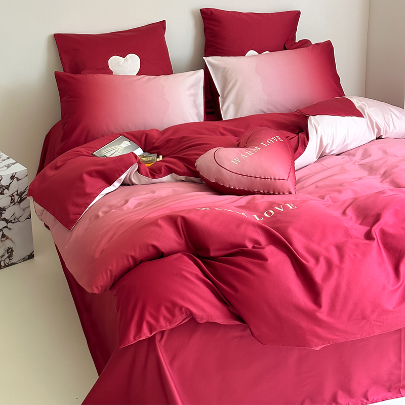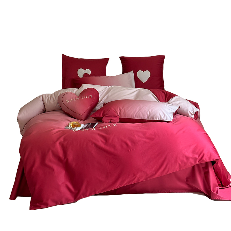 高端渐变红婚庆纯棉四件套160S全棉结婚轻奢简约爱心长绒棉床单款
