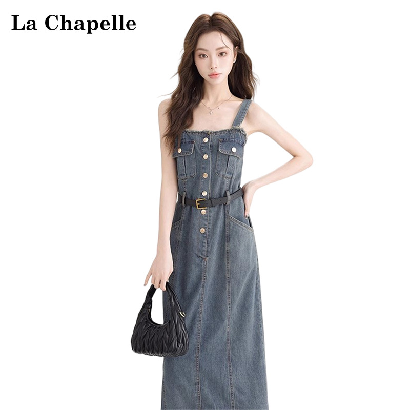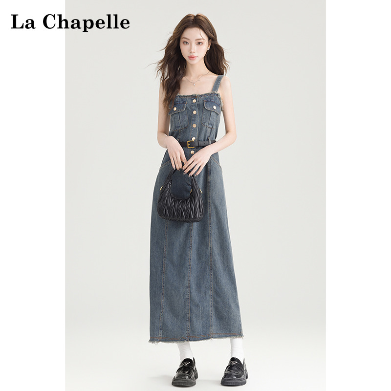 拉夏贝尔复古牛仔无袖吊带连衣裙女夏季新款毛边开叉高腰显瘦长裙