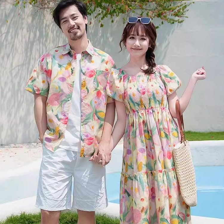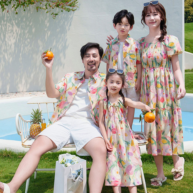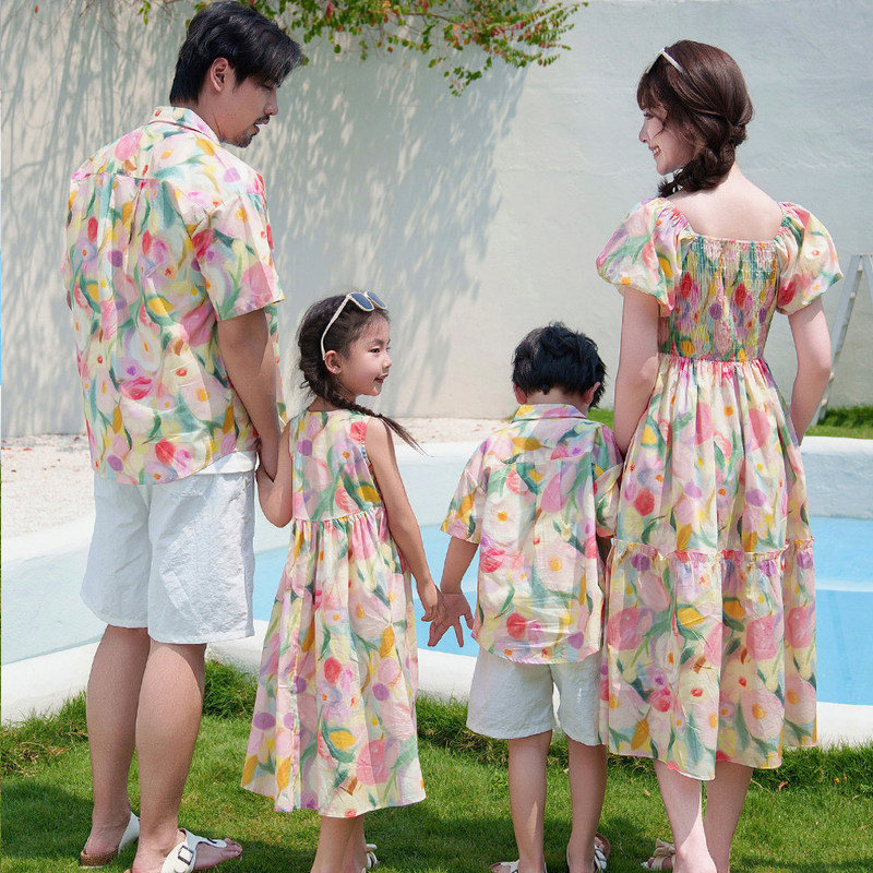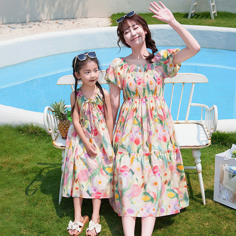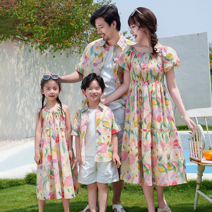 海边度假亲子装三亚一家三口四口母女款碎花连衣裙沙滩裙母子夏季