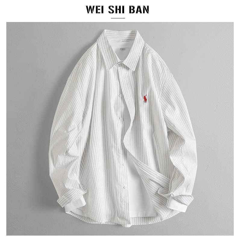 春秋季轻奢极简小马标刺绣长袖衬衣男条纹老钱风蓝调阔版保罗衬衫