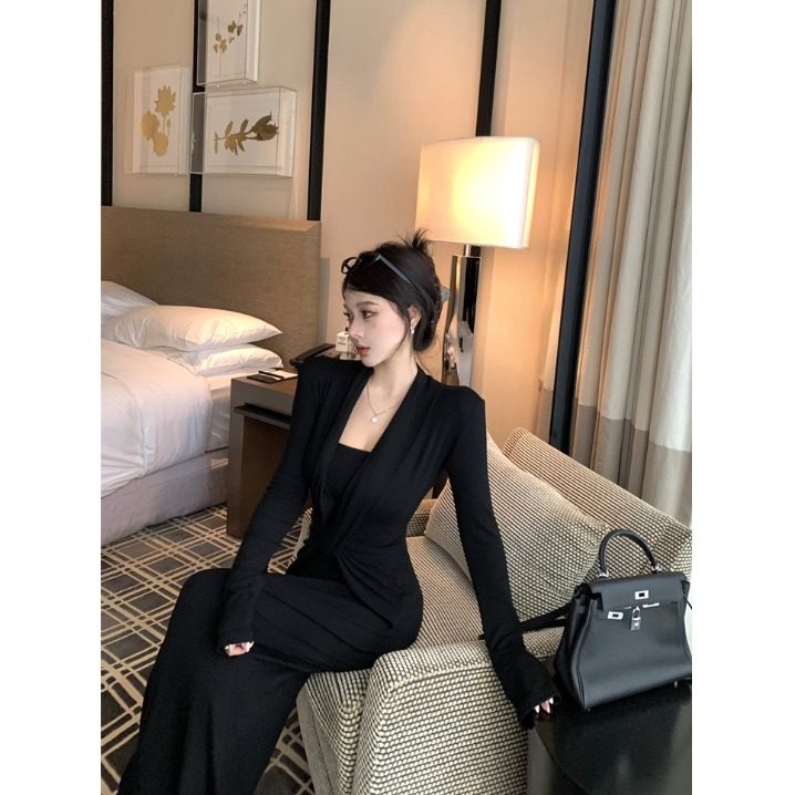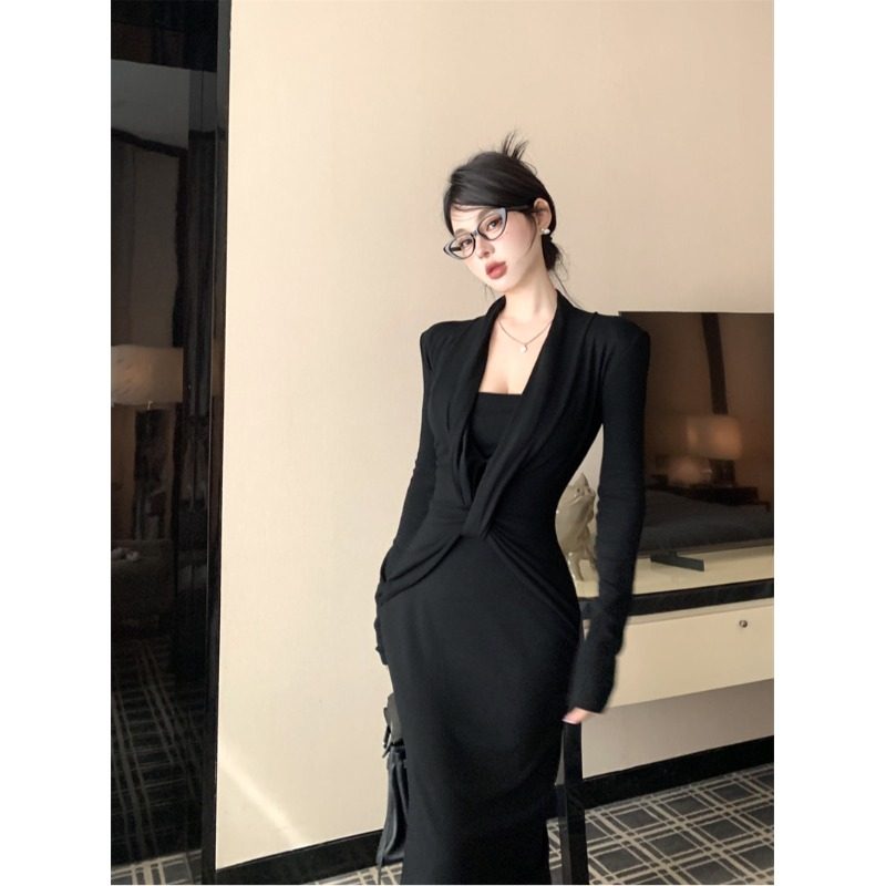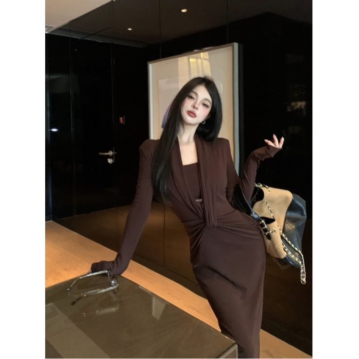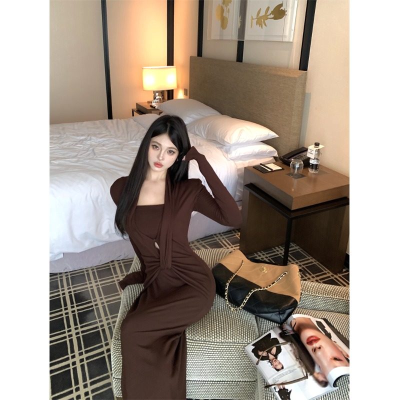 设计感纯欲扭结长袖连衣裙鱼尾裙子女秋冬套装咖色抹胸叠穿两件套