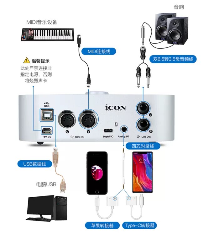 icon艾肯声卡连接音响线