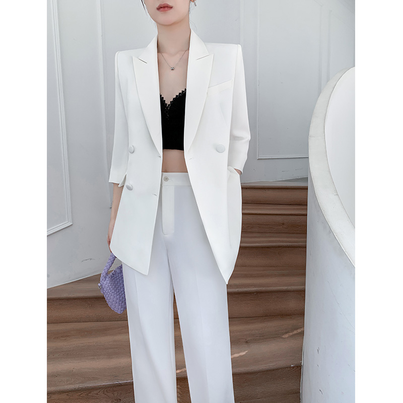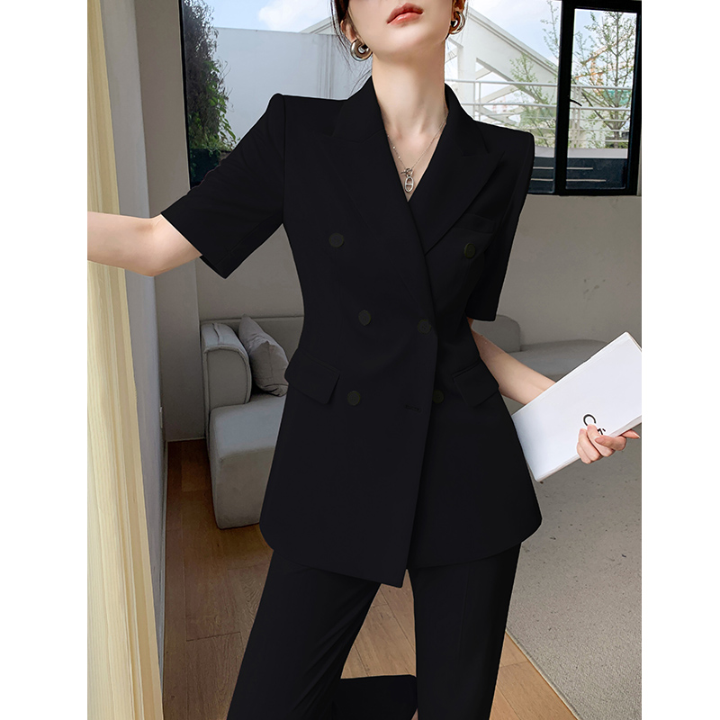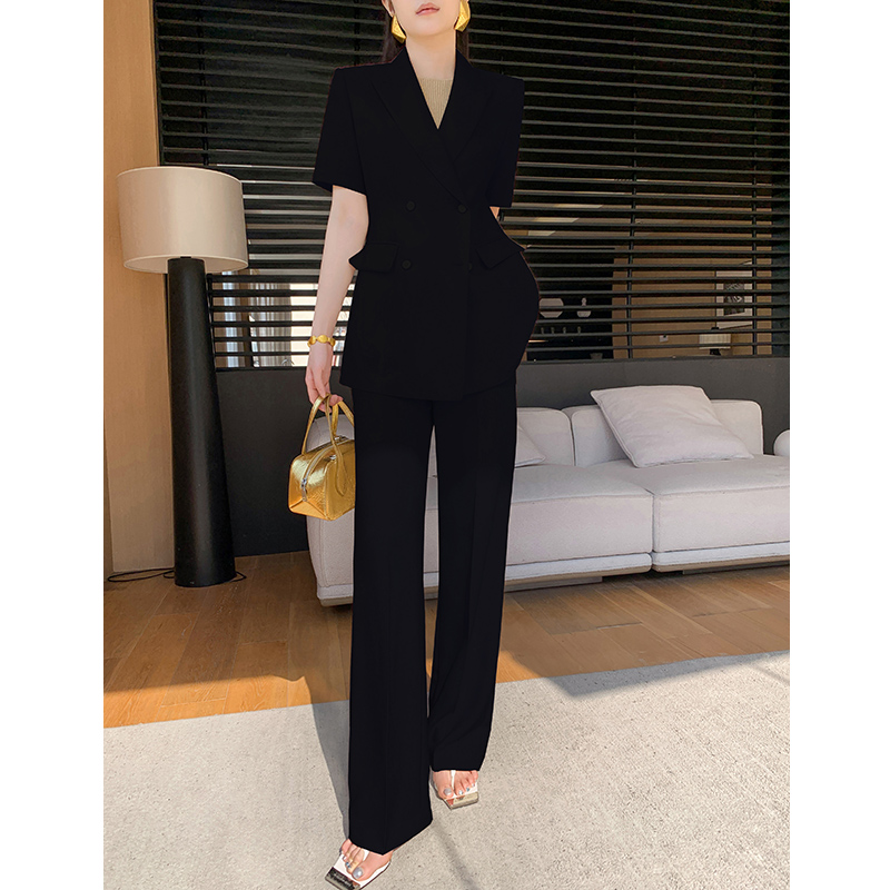 黑色夏天西装套装女2025新款高级感小个子薄款短袖阔腿裤休闲西服