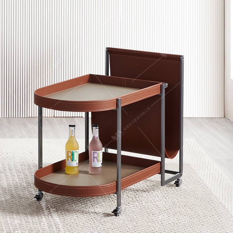轻奢马鞍皮沙发边几 客厅阳台可移动置物架 设计感推车小户型茶几