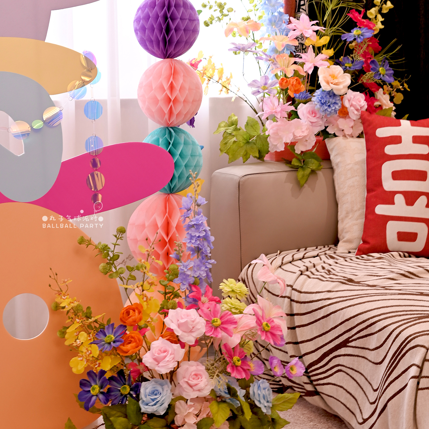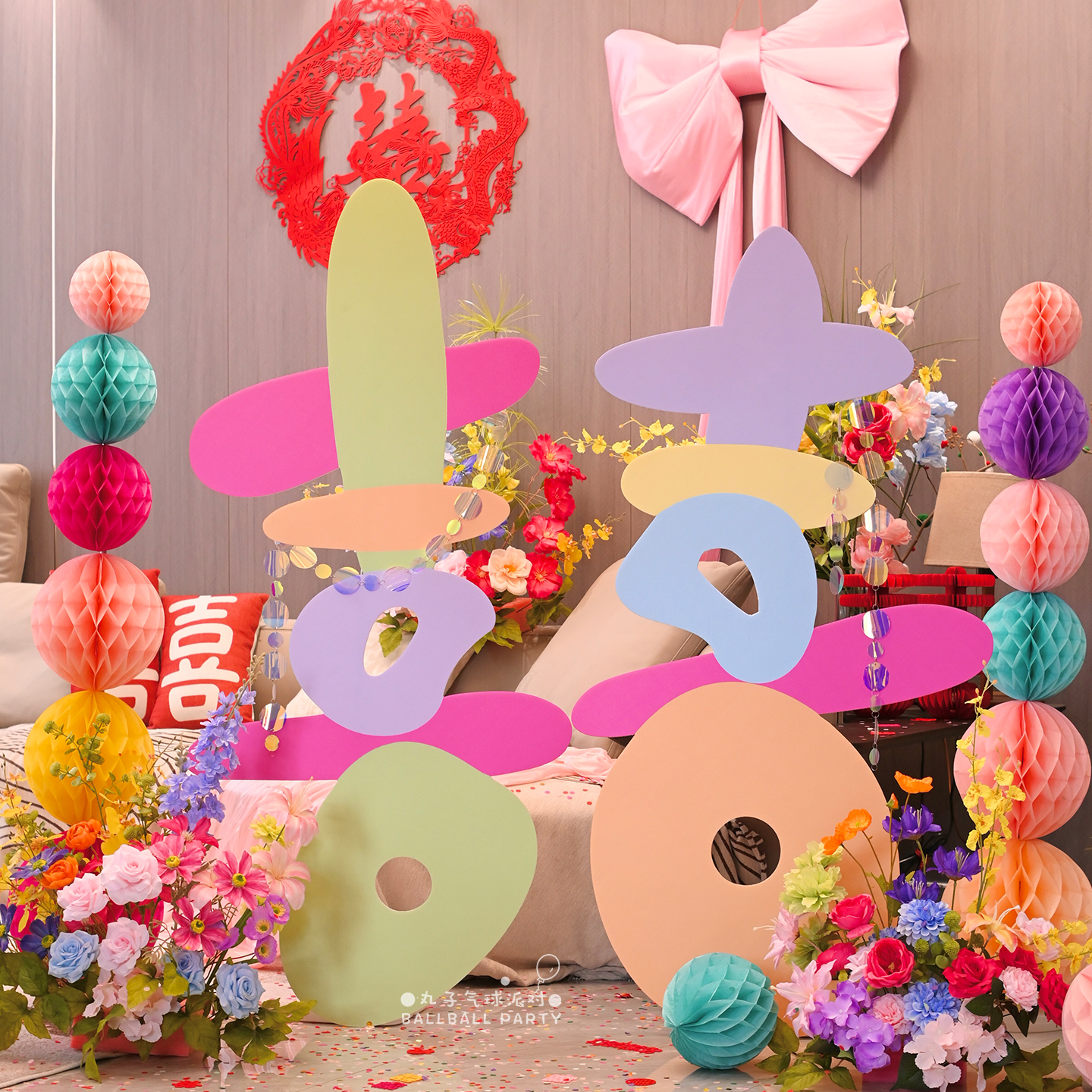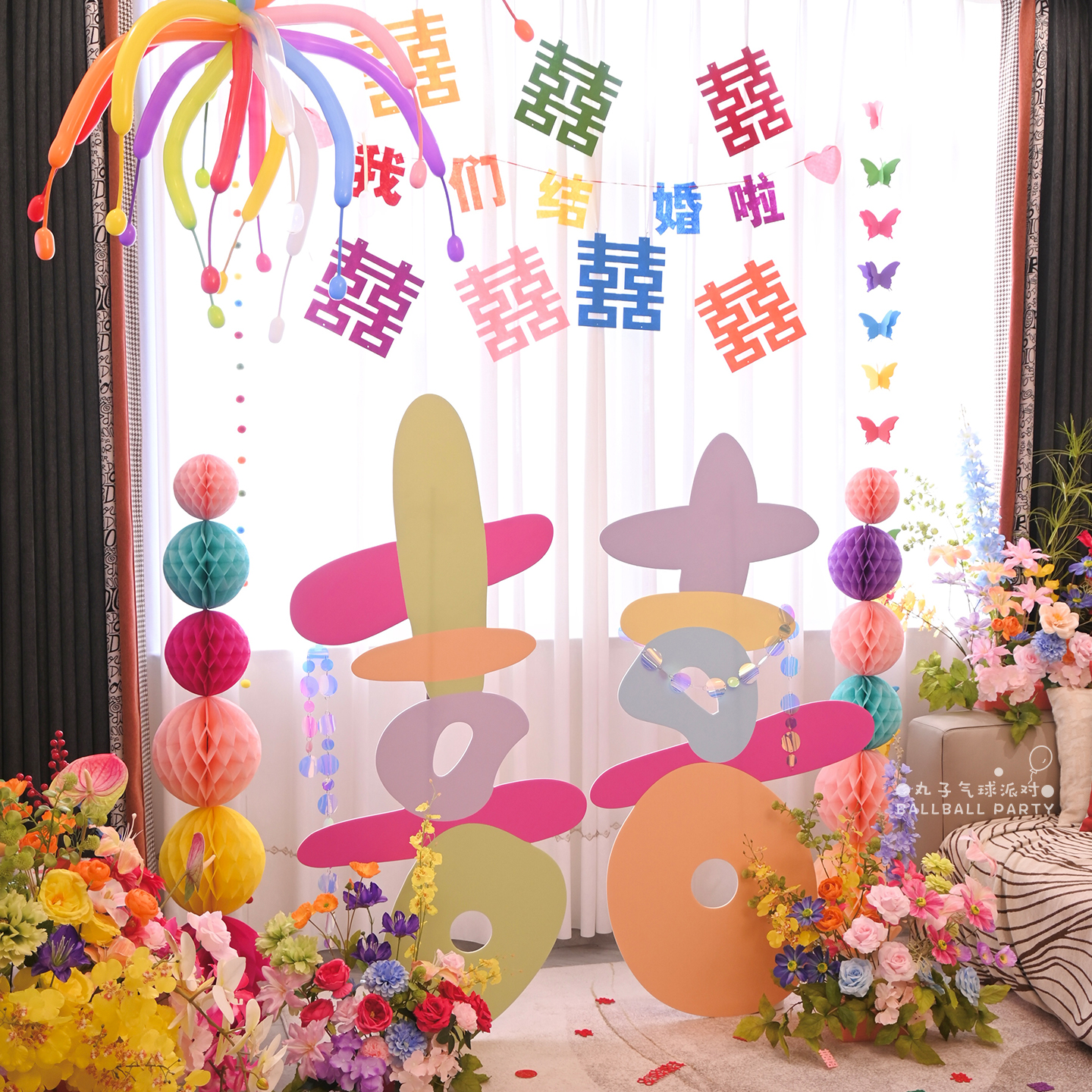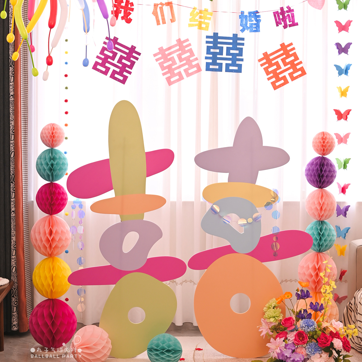 多巴胺超大彩色喜字KT板结婚房装饰花艺立柱晨袍拍照背景婚礼布置