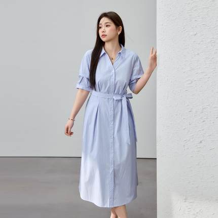 【盐系纯棉收腰条纹衬衫连衣裙】纤莉秀大码女装胖mm2025春装新款